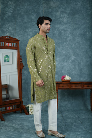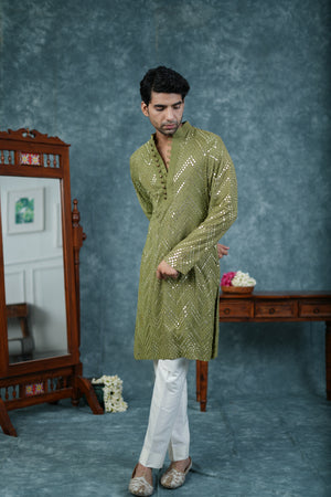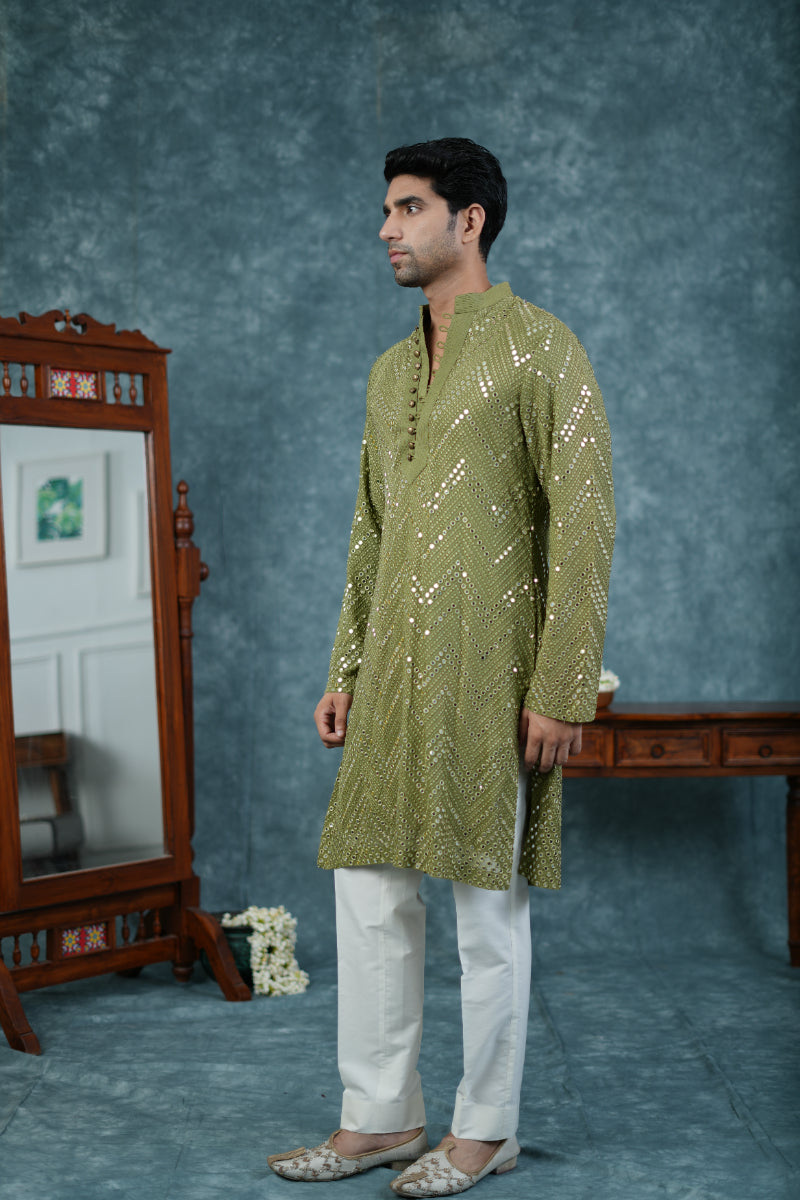 Featuring a Fern Green kurta in silk base with sequins embroidery. It is paired with white pantsto show elegence. Perfect attire for any festive occasion or sangeet ceremony, exuding charm and timeless elegance.