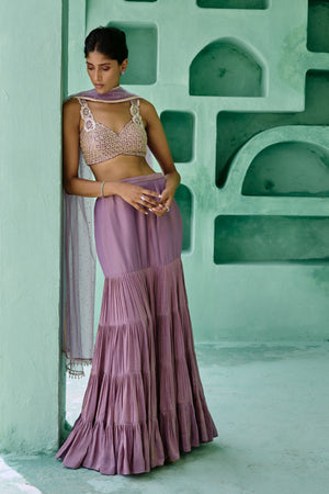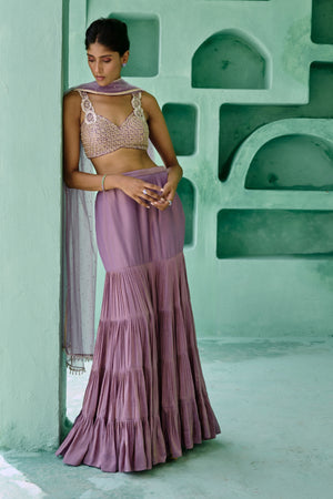 Tissue silk frill skirt paired with glass beads and pearl embroidered raw silk blouse and tulle dupatta.