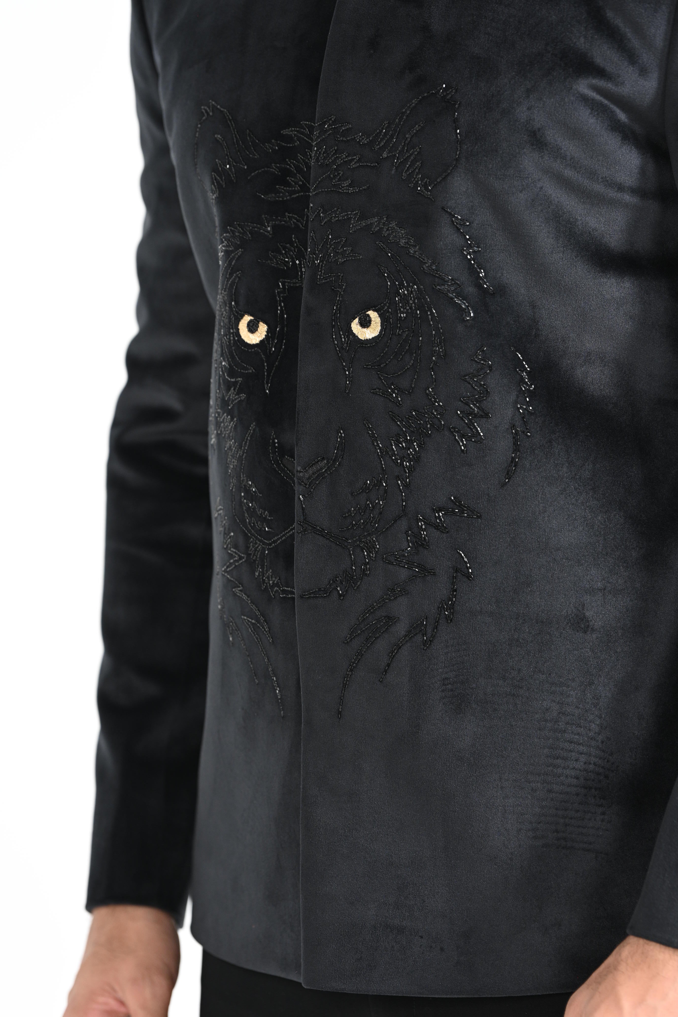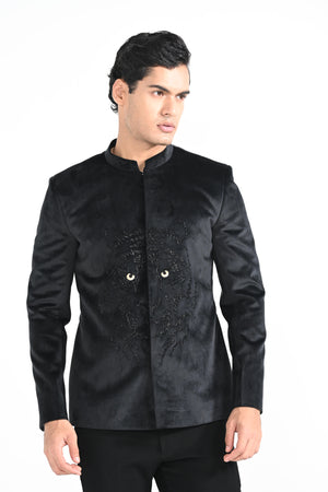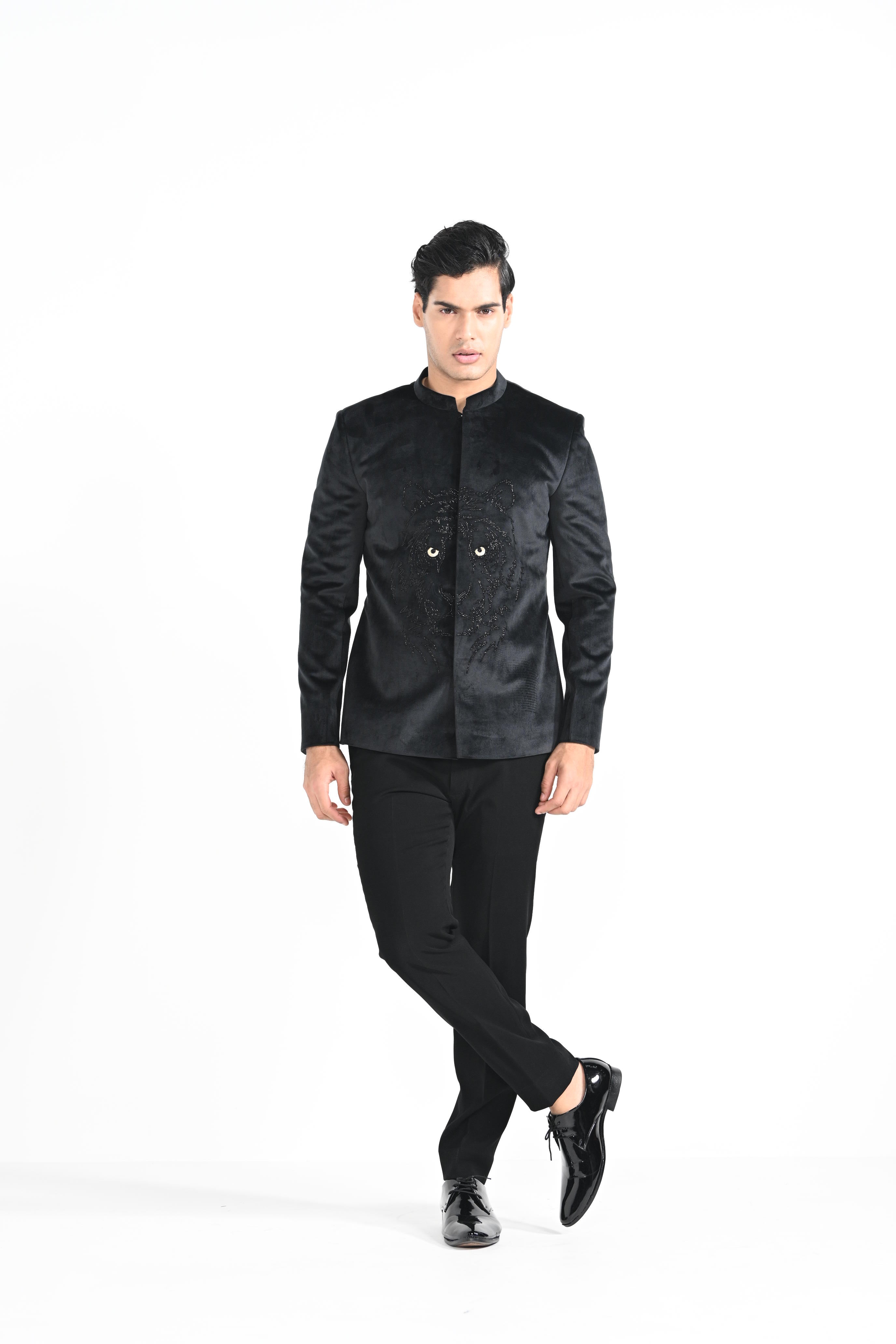 Black fiery Tiger Bandhgala highlighed with cutdana and made with suede fabric. Paired with Black slim fit Trousers. Color of the actual garment may vary due to lighting conditions during the shoot .