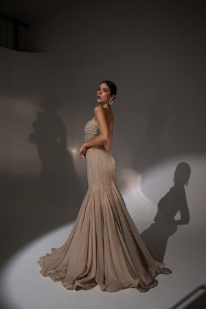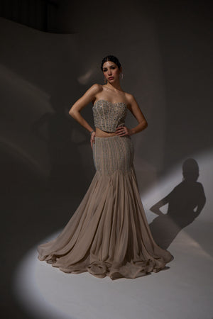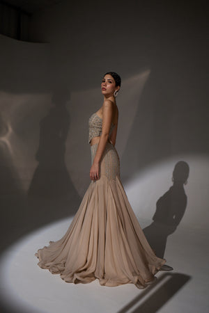 A breathtaking fusion of Western structure and Indian grace — this ensemble features a long corset-style gown that cinches the waist and highlights the form, paired with a dramatic fish-cut lehenga for a sculpted, hourglass silhouette. The design flows with sophistication while retaining bold femininity.