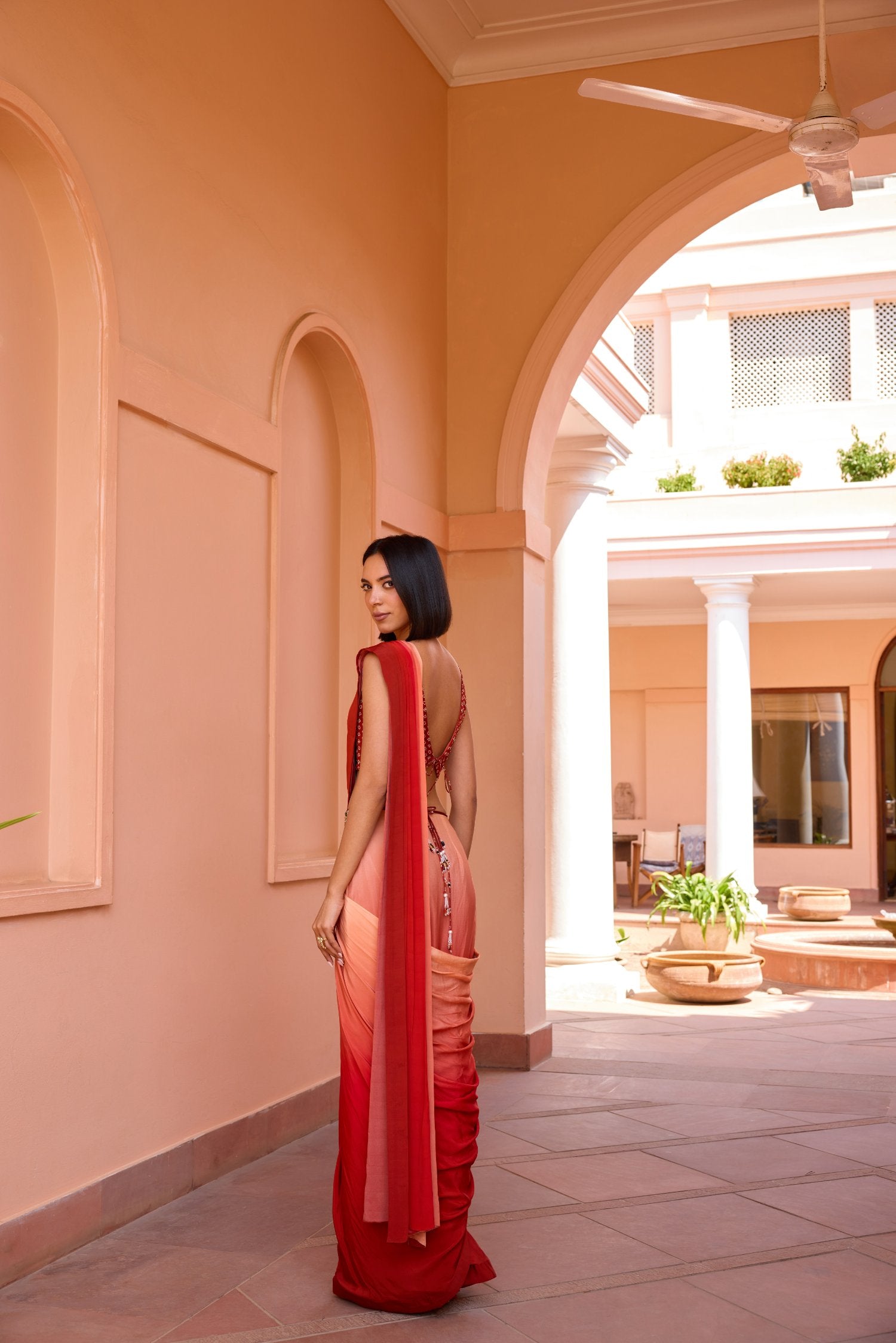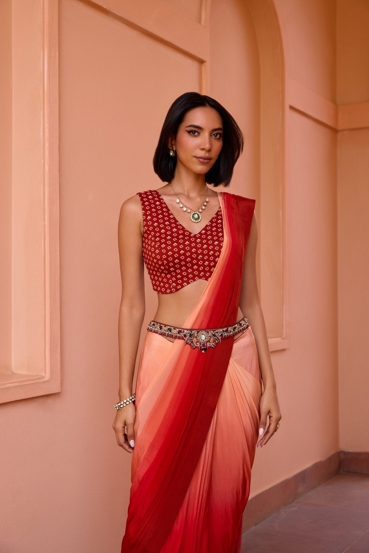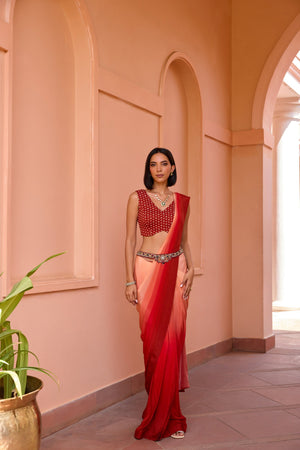 Featuring and Ombre pre stitched saree made in crepe, it is paired with a bandhani adorned and embroidered blouse. The jewel encrusted embroidered free size kamarbund belt redefine and complete the festive look.