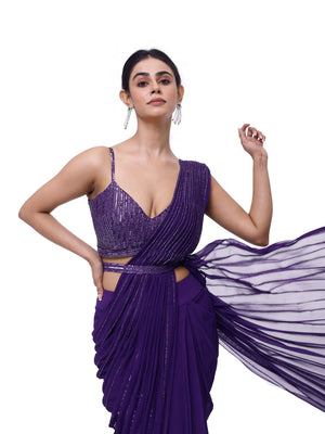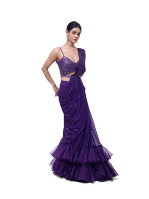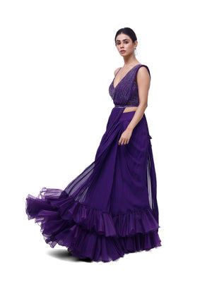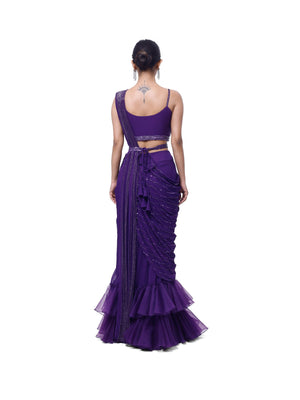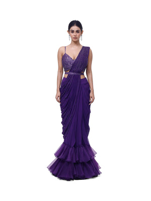 Embellished violet georgette saree with ruffles accentuating the fish cut. Comes with an embellished strappy deep neck bodice and a narrow embellished belt. Embellishments include cutdana and sequin work.