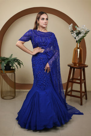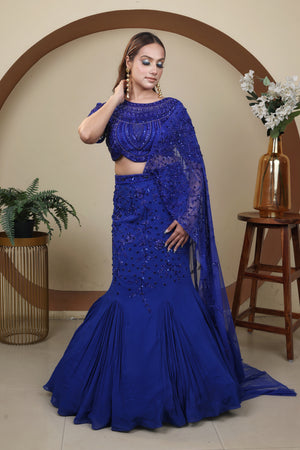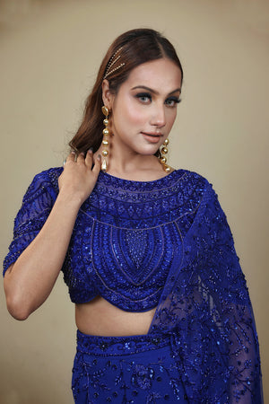 A royal blue lehenga paired with a hand embroidered blouse embedded with self color crystals, sequins, glass beads, Swarovski