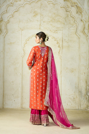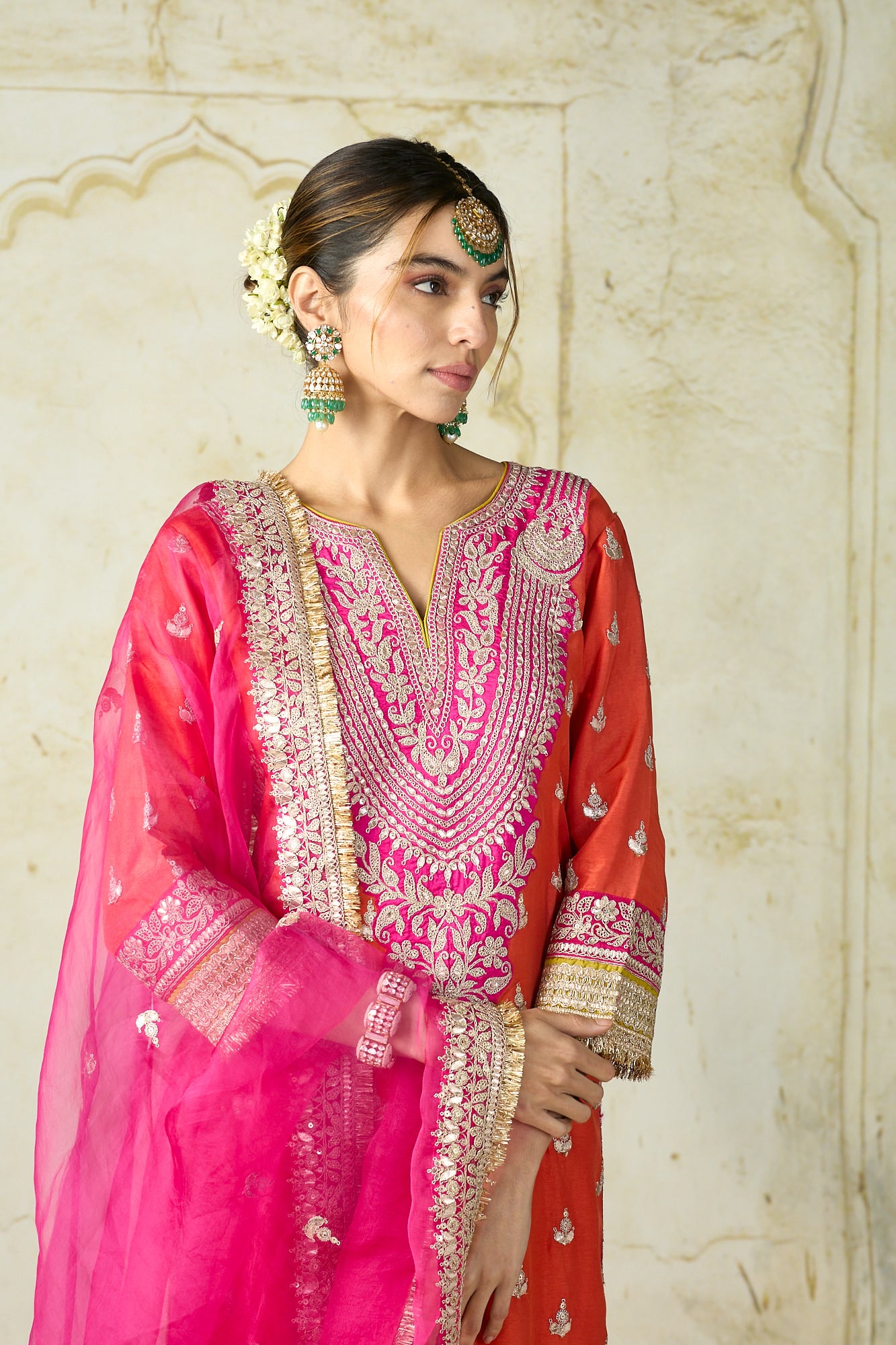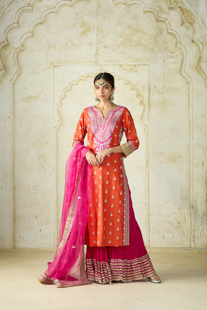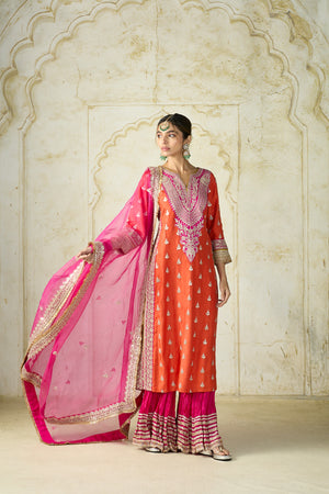 The straight-cut kurta features intricate work along the neckline and cuffs, with scattered motifs enhancing its regal appeal. Paired with a striking contrast crinkled sharara the ensemble balances bold color play with traditional charm. The sheer matching dupatta, finished with an embellished border and delicate motifs, completes the look with grace.