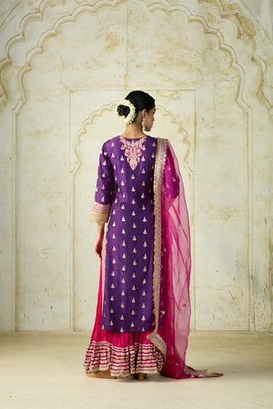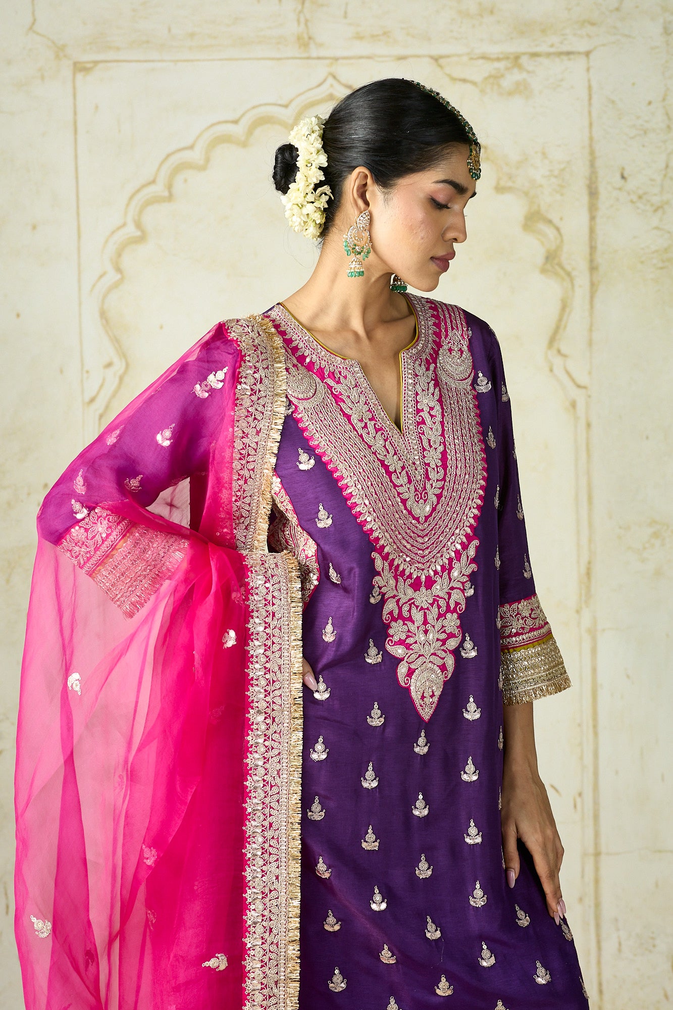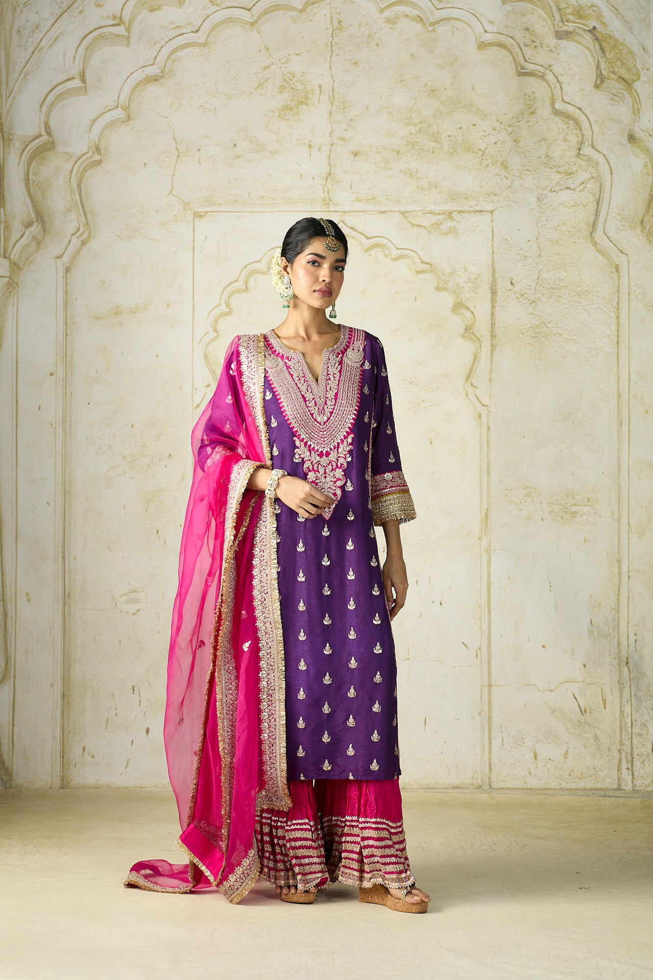 The straight-cut kurta features intricate work along the neckline and cuffs, with scattered motifs enhancing its regal appeal. Paired with a striking contrast crinkled sharara the ensemble balances bold color play with traditional charm. The sheer matching dupatta, finished with an embellished border and delicate motifs, completes the look with grace.