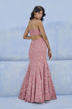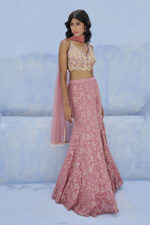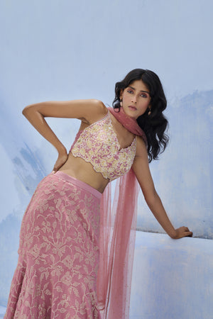 Fit and flare skirt with floral sequence embellishments paired with sequence and glass beads embroidered blouse and tulle dupatta.