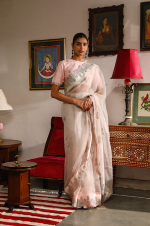 Fizaa Saree is crafted in an ombre effect of blush pink and subtle grey tone. The saree is precisely crafted in floral embroidery motifs. The highlight of this ensemble lies in its fully scalloped edges, adding a touch of whimsical charm to the silhouette. Each scallop is delicately crafted to perfection, enhancing the overall allure of the saree.