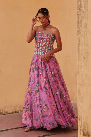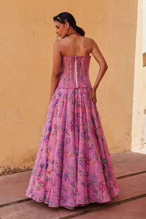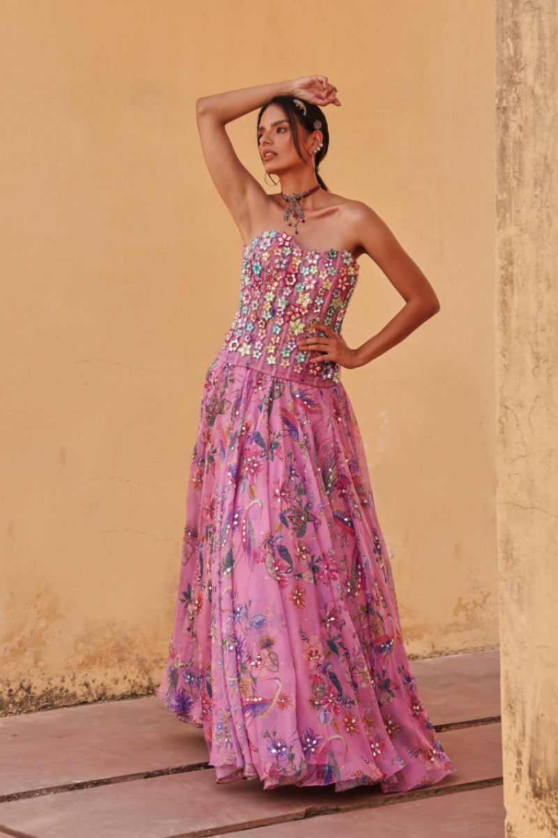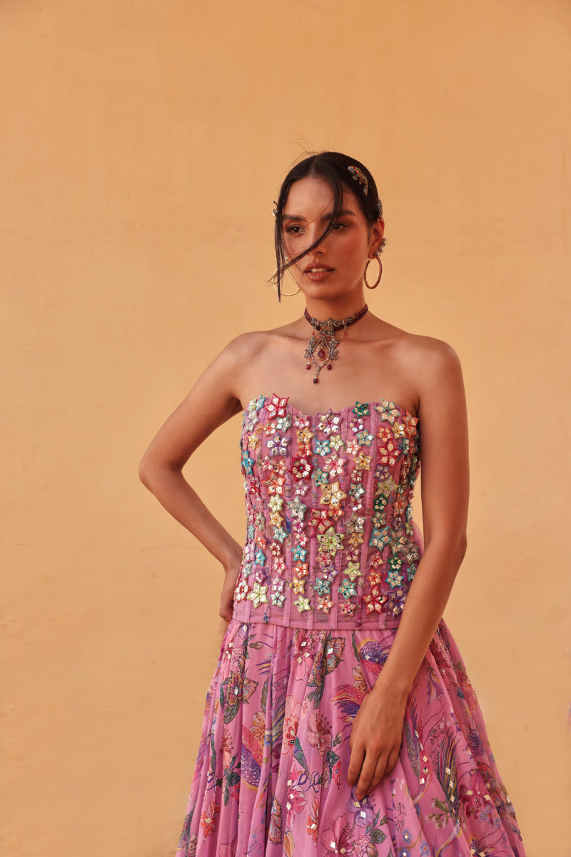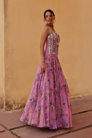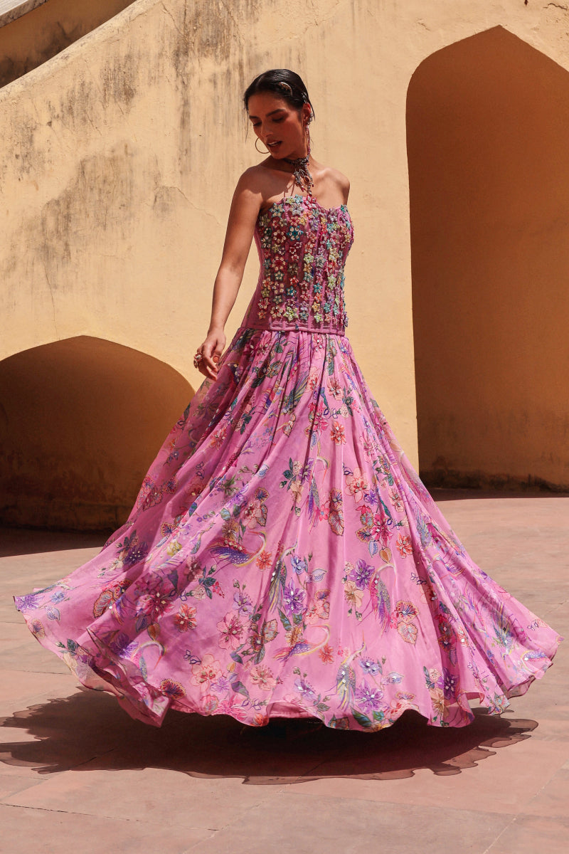 This elegant lehenga features a printed pure organza hand embroidered skirt with a flowing silhouette. The long corset-style top showcase applique patches made with mirror embroidery.