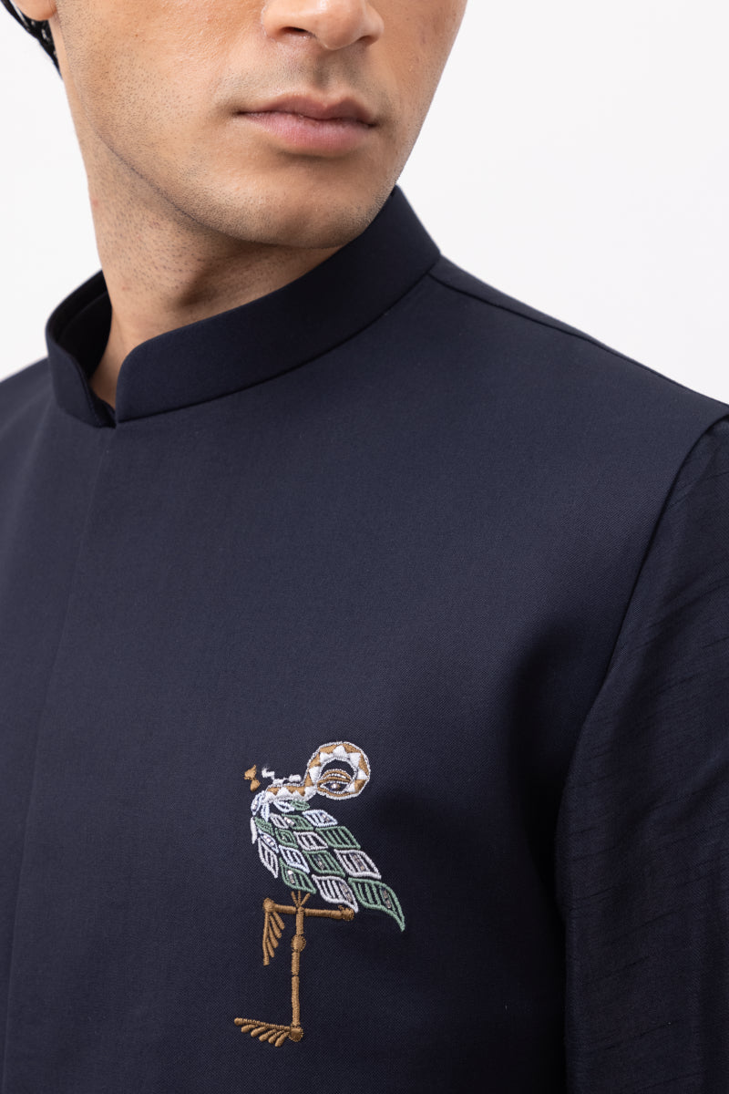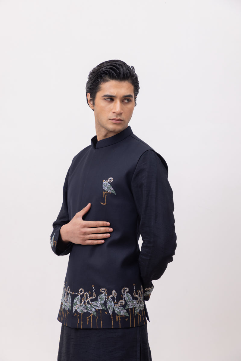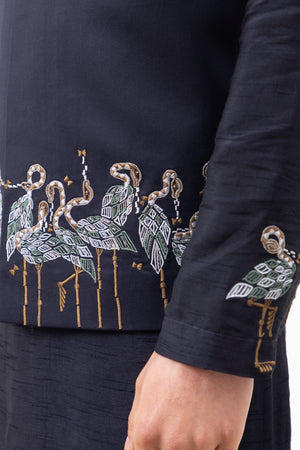 A navy designer Nehru jacket adorned with silver flamingos, gracefully scattered at the hem and chest, this piece balances minimalism with majestic detailing for modern celebrations.