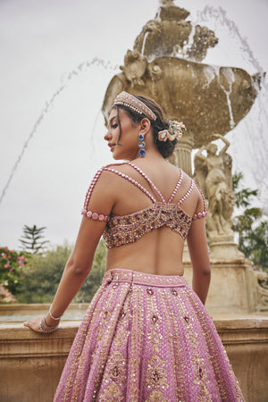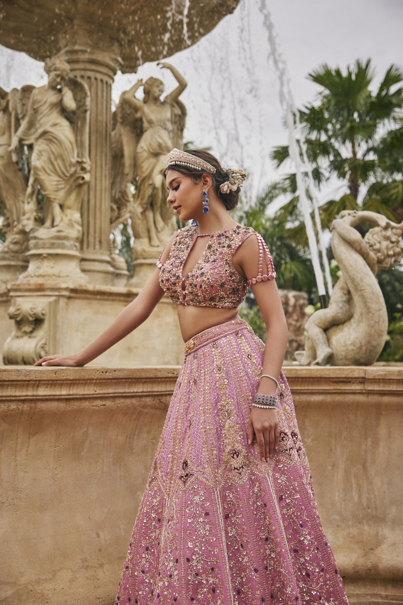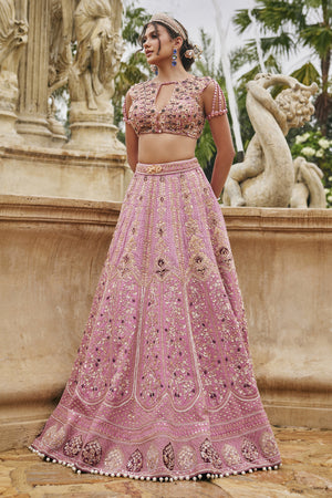 In a dreamy flamingo pink hue, this lehenga set exudes elegance and charm. The lehenga features exquisite Lakhnawi embroidery, intricately adorned with kasab poat, fine threadwork, and delicate jardosi detailing, adding a rich handcrafted texture. Paired with a uniquely designed blouse, it stuns with crystal embellishments and statement mother-of-pearl sleeves that shimmer with every movement. The matching dupatta completes the ensemble with grace, making this couture piece perfect for festive occasions, weddings, or bridal functions where traditional artistry meets modern sophistication.