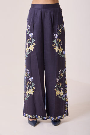 Tailored in a lightweight linen-satin blend, these navy pants feature a refined placement floral print that mirrors the matching shirt. Comfortable yet statement-making, they transition effortlessly from daytime polish to elevated evening style.