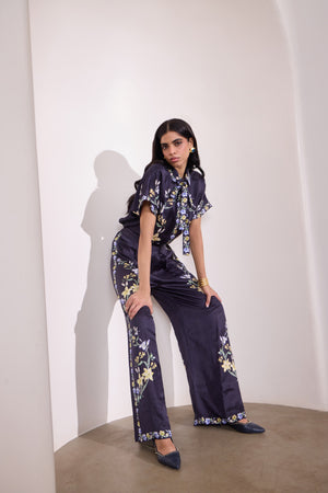 Crafted in a linen-satin blend, this navy shirt features a vibrant placement floral print that feels both modern and timeless. Its soft sheen and fluid structure make it perfect for day-to-evening wear, paired best with its matching trousers for a coordinated look.