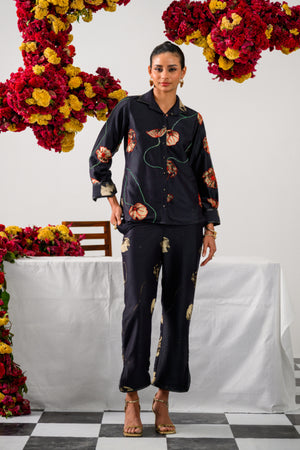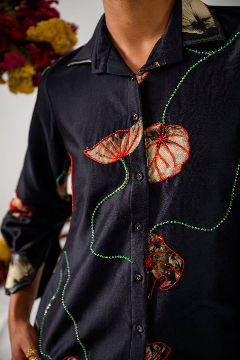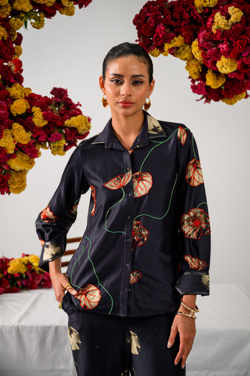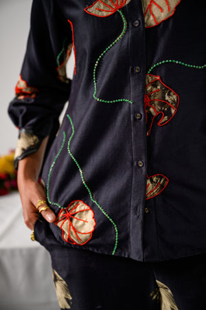 the Opium Fairy Shirt, a spellbinding creation in black Chanderi adorned with a vintage floating floral print. This shirt casts a bewitching spell with its vibrant red beadwork highlighting the petals, while green sequin stems weave a touch of magic. The design is flawlessly finished with leather-bound cuffs and collar, adding a touch of edge to its ethereal charm.