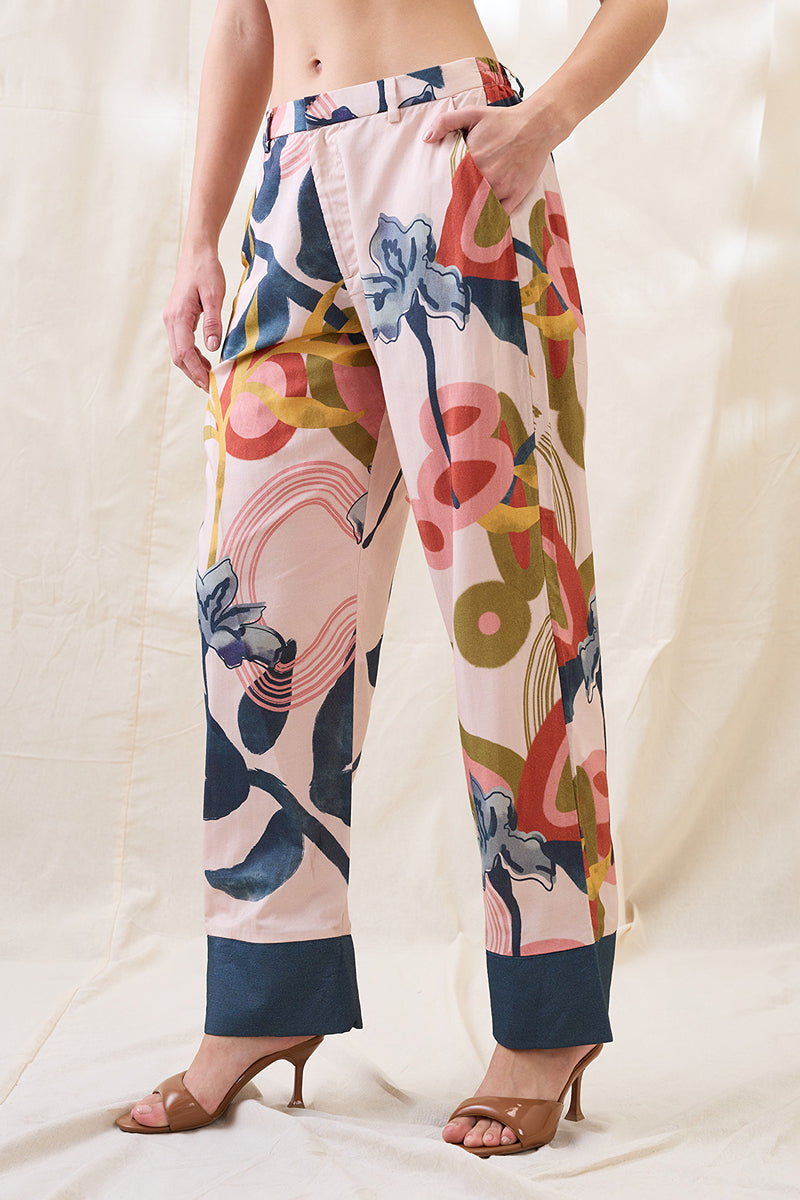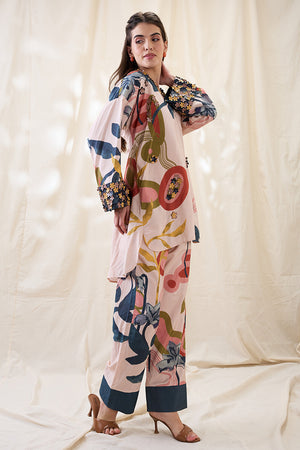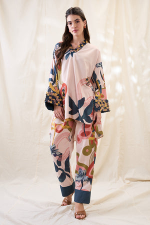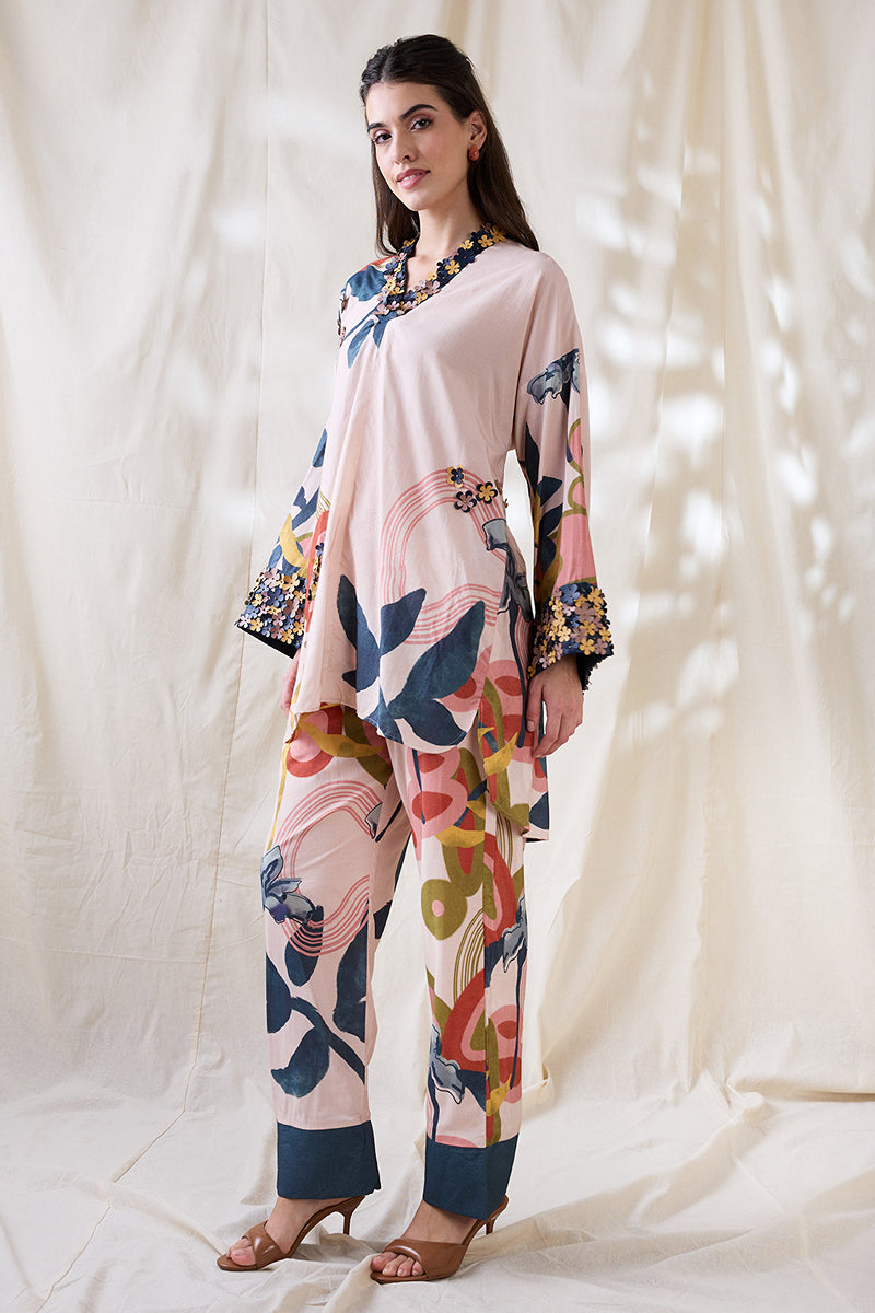 Beige flora embellished kurta tunic with straight fit pants in chanderi.