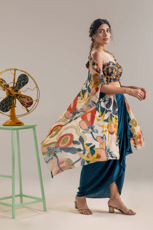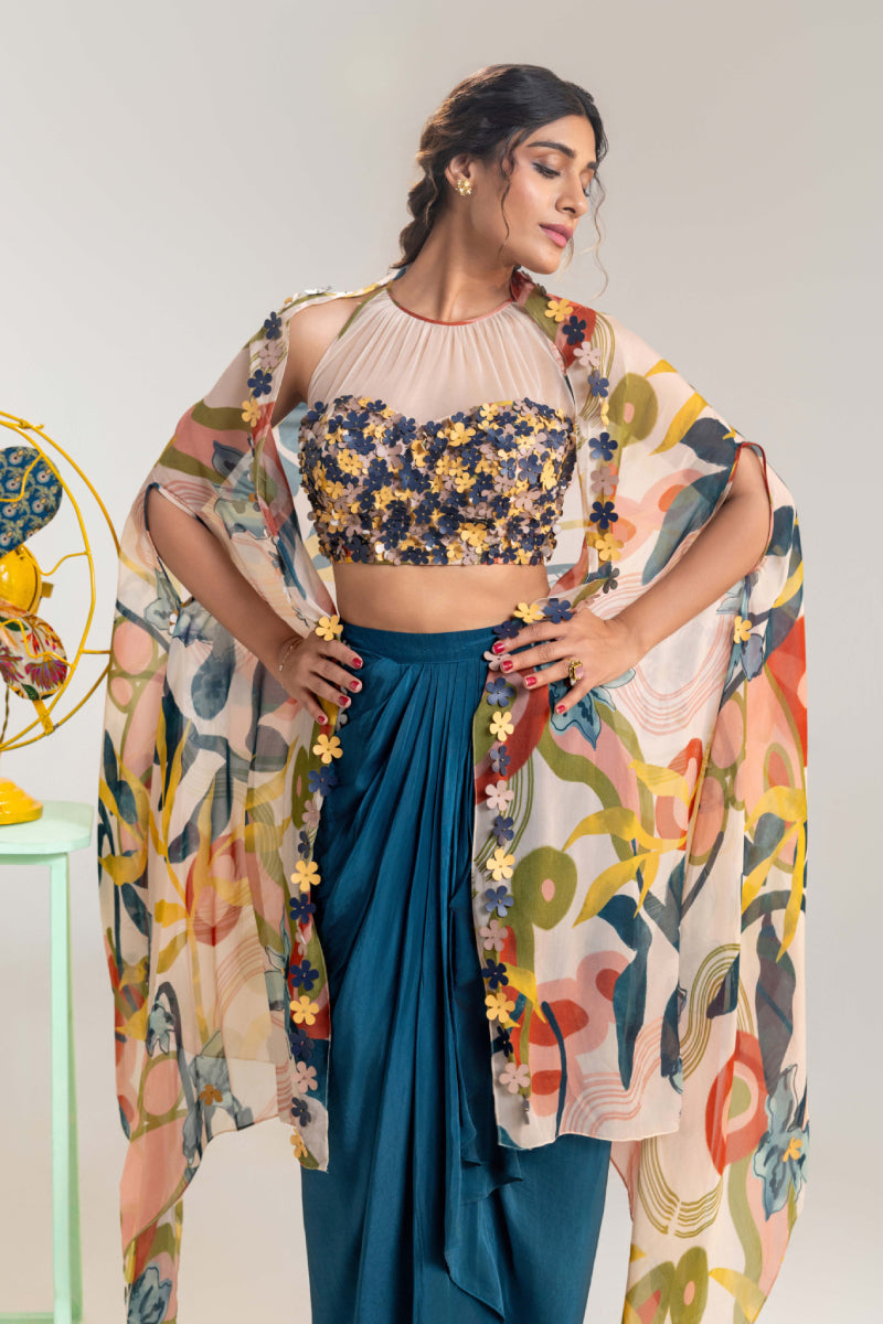 Flora embroidered drape skirt set with a cape