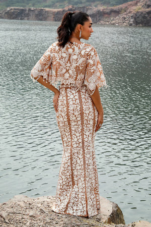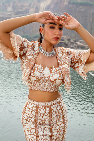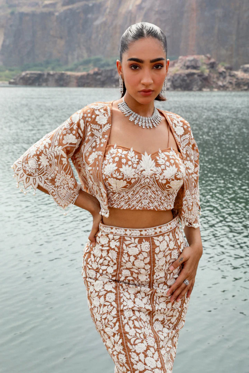 This Champagne Couture Fishcut Lehenga Has White Floral Resham Hand Embroidery, Paired With Fully Embroidered Floral Blouse And An Embroidered Organza Jacket