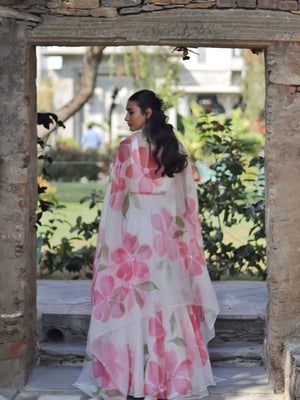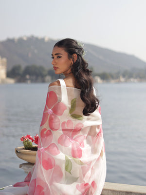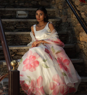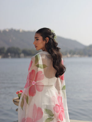 Set Of 3: Stitched Hand-Painted Organza Lehenga + Hand-Painted Organza Dupatta + Unstitched 1M Modal Silk Blouse Piece Both Lehenga And Dupatta Are Enhanced With Sequins Work