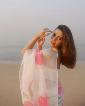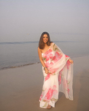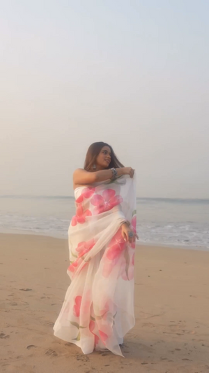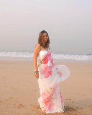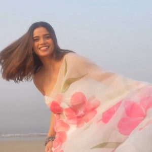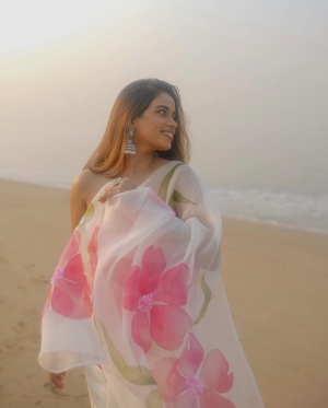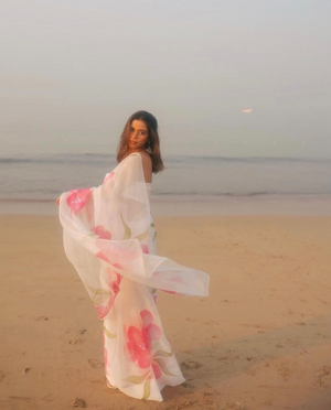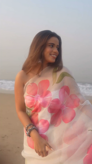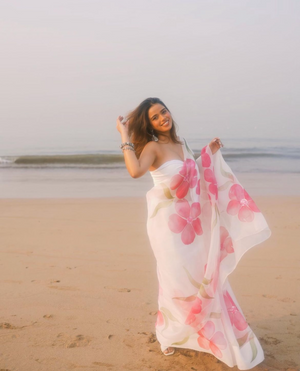 White Base Pure Organza Saree Hand-Painted With Pink Flowers Enhanced With Sequins Work