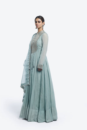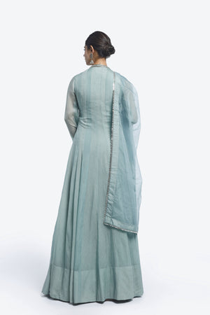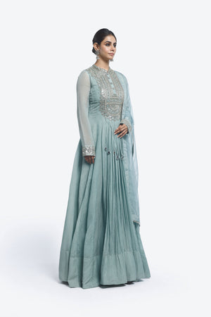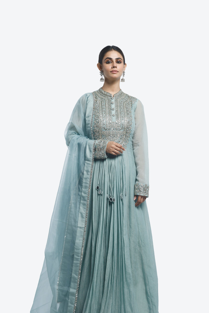 Crush Fabric Chinese collar suit set featuring heavy mirror work on the upper body. Comes with pants and an Organza dupatta. All Embellishments include mirror, cutdana, Dabka work.