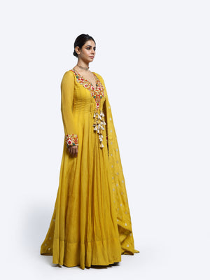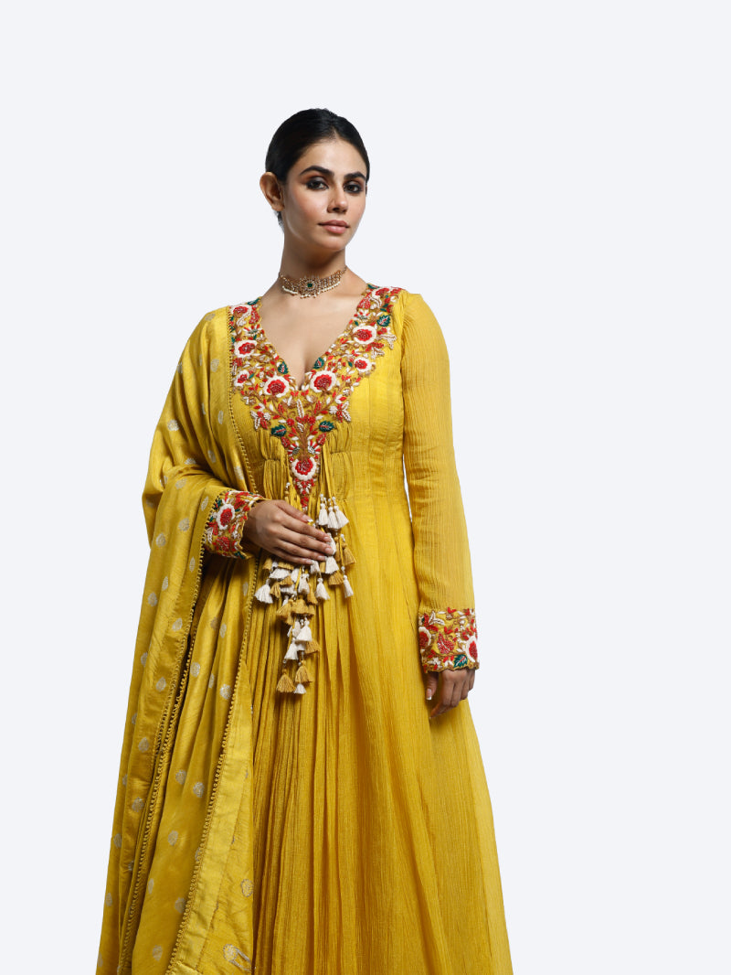 Crush fabrics Anarkali suit set featuring a multicolor floral thread embroidered full sleeve and full length suit, champagne embroidered dupatta and pants.