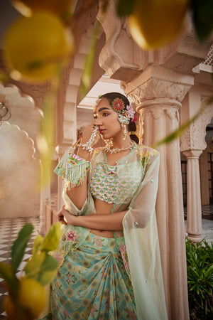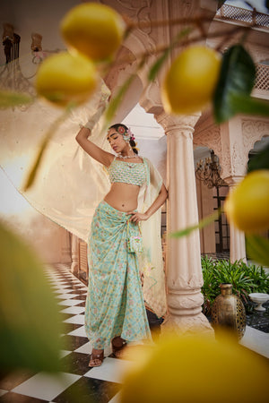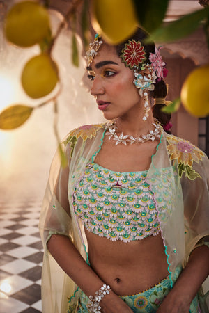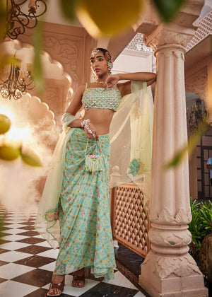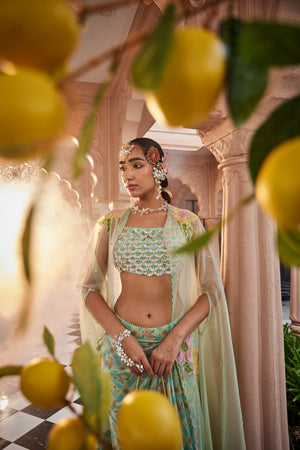 Introducing a floral-printed flared skirt set, paired with a stylish cape and a 3D flower-embroidered crop top. The blooming floral print on the outfit is both stunning and on-trend. The cape is accented with cutwork hand embroidery on the shoulders, cascading elegantly down the arms, adding a touch of sophistication to the ensemble