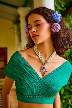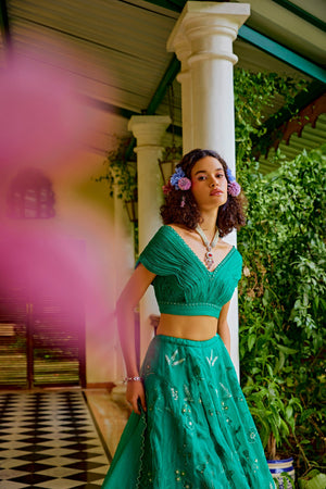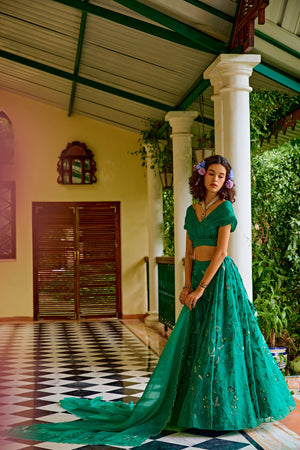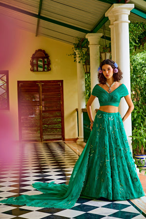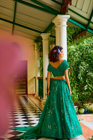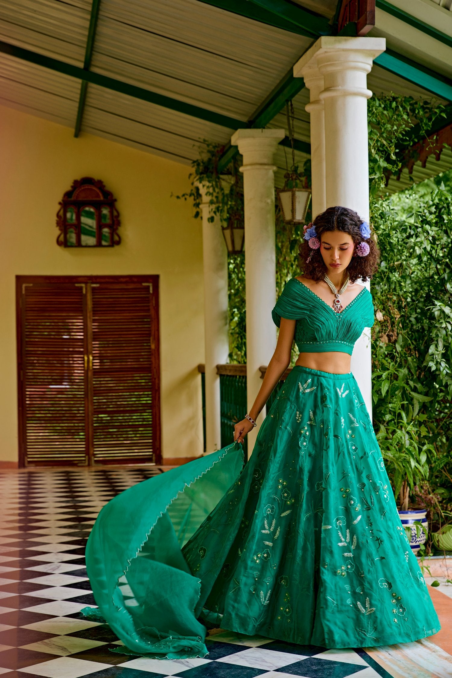 Immerse yourself in opulence with our forest green organza kalidar lehenga, adorned in intricate embroidery, appliqué, and silver zari work. Paired harmoniously with a chiffon crushed off-shoulder blouse and an organza dupatta delicately embroidered on the pallu. This ensemble exudes luxury and is perfect for weddings, grand celebrations, and upscale events. Elevate your style with this exquisite combination that captures the essence of tradition and contemporary grace effortlessly.Model Info: