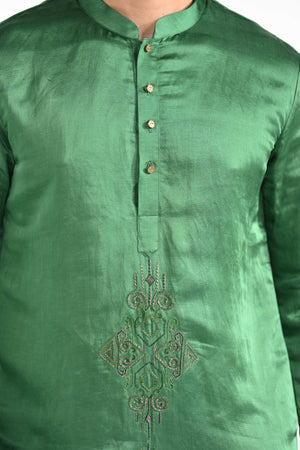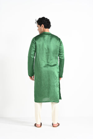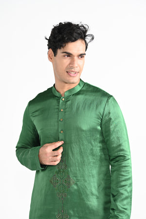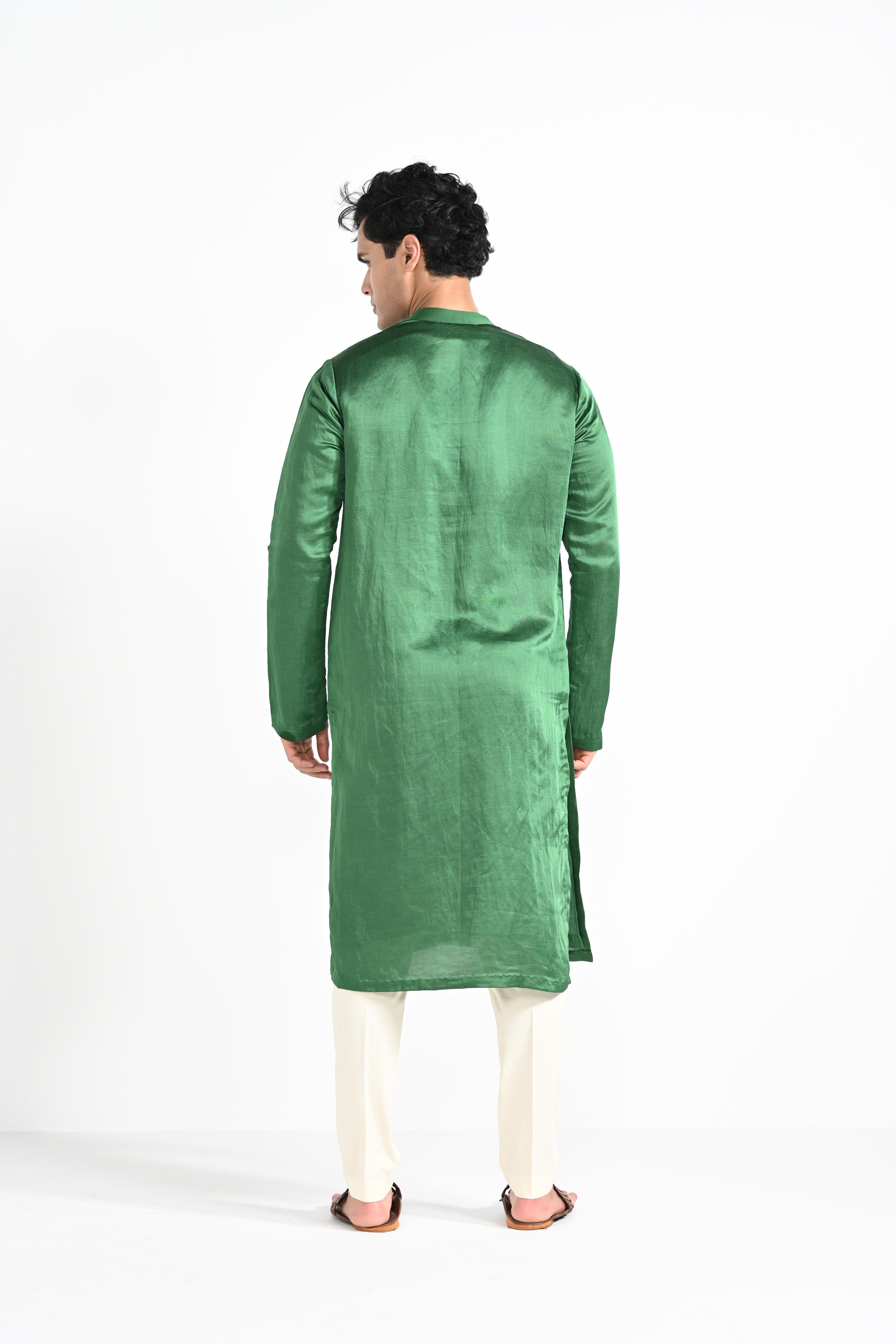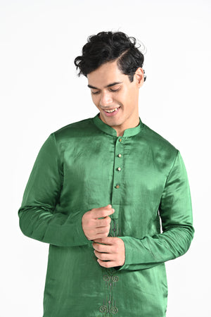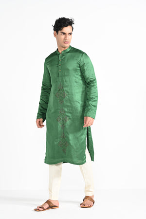 Froest Green thread work hand embroidered on linen Satin.Paired with Buttercream slim fit Pant Pajama. Color of the actual garment may vary due to lighting conditions during the shoot .
