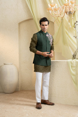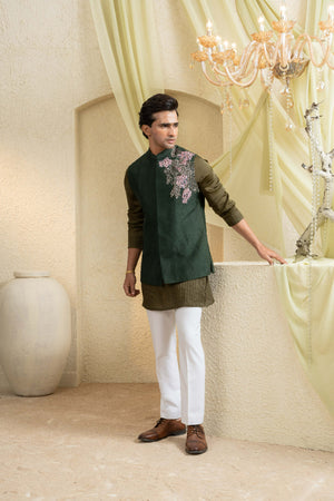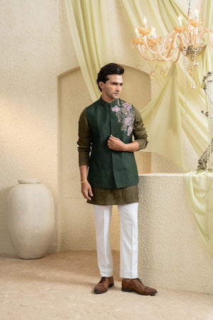Impeccably tailored in forest olive, this Bundi set is adorned with intricate hand embroidery that sweeps across the shoulder, creating a refined focal point. Paired with a crisp kurta and tapered trousers, it offers a distinguished balance of tradition and modern polish for celebratory dressing.