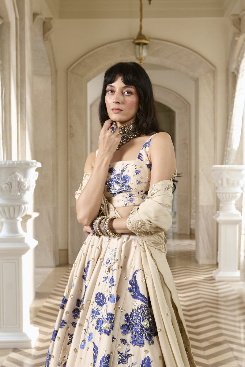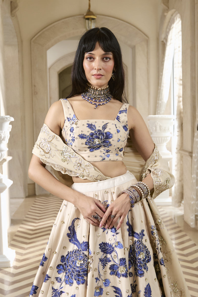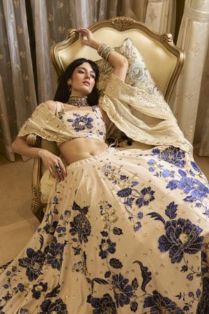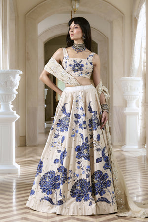 An ivory chiniya lehenga adorned with delicate blue floral prints, brought to life through intricate aari, zardozi, and sequin detailing. It is paired with a square-neck blouse showcasing exquisite hand embroidery, complemented by a sheer organza dupatta, finely embellished with delicate hand-embroidered accents and scalloped edge finish.