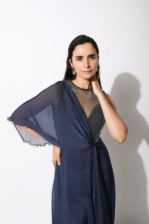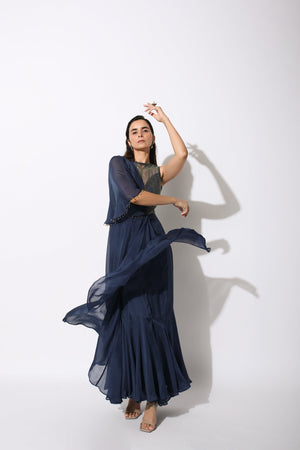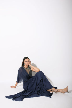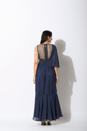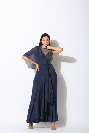 Free flowing gown in Navy Blue with yoke in rhinestones. It has one sided cape enhanced with tiny droplets of stones.