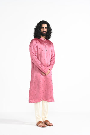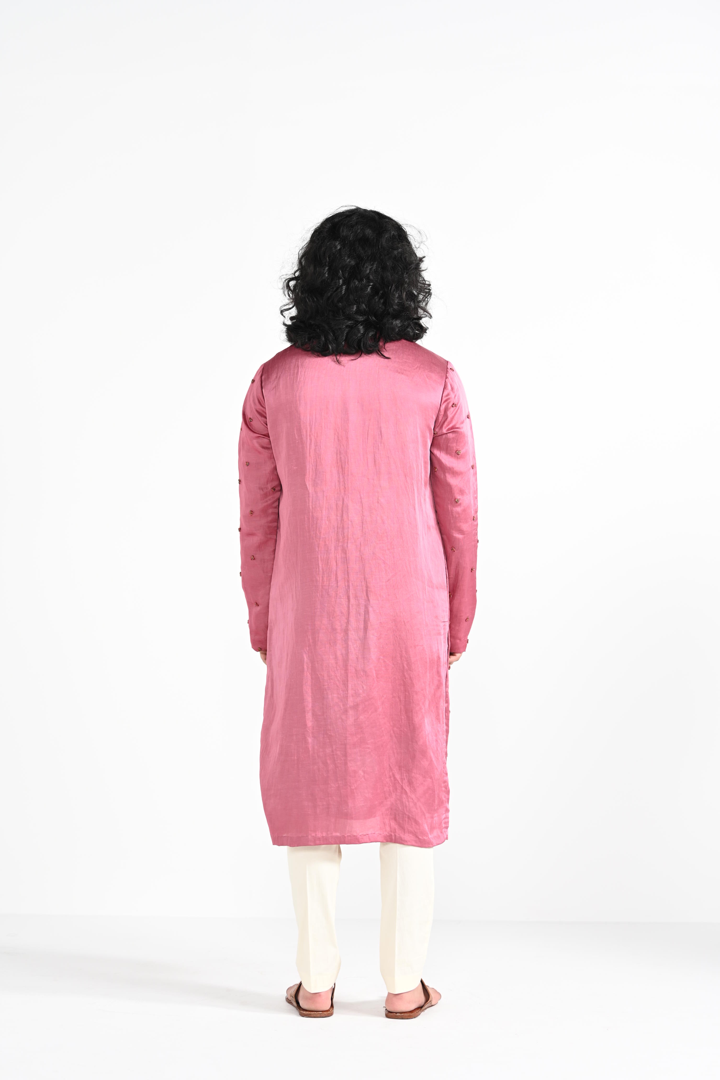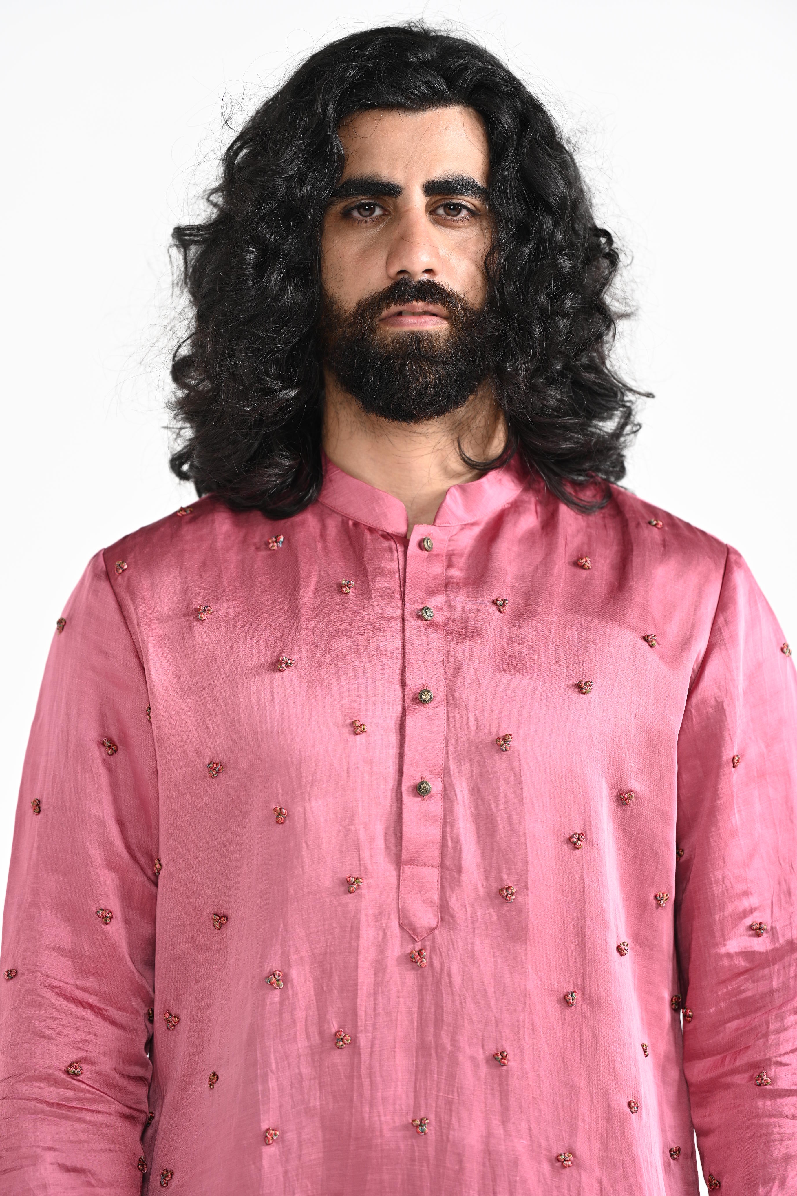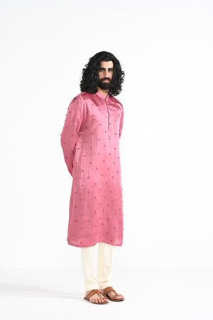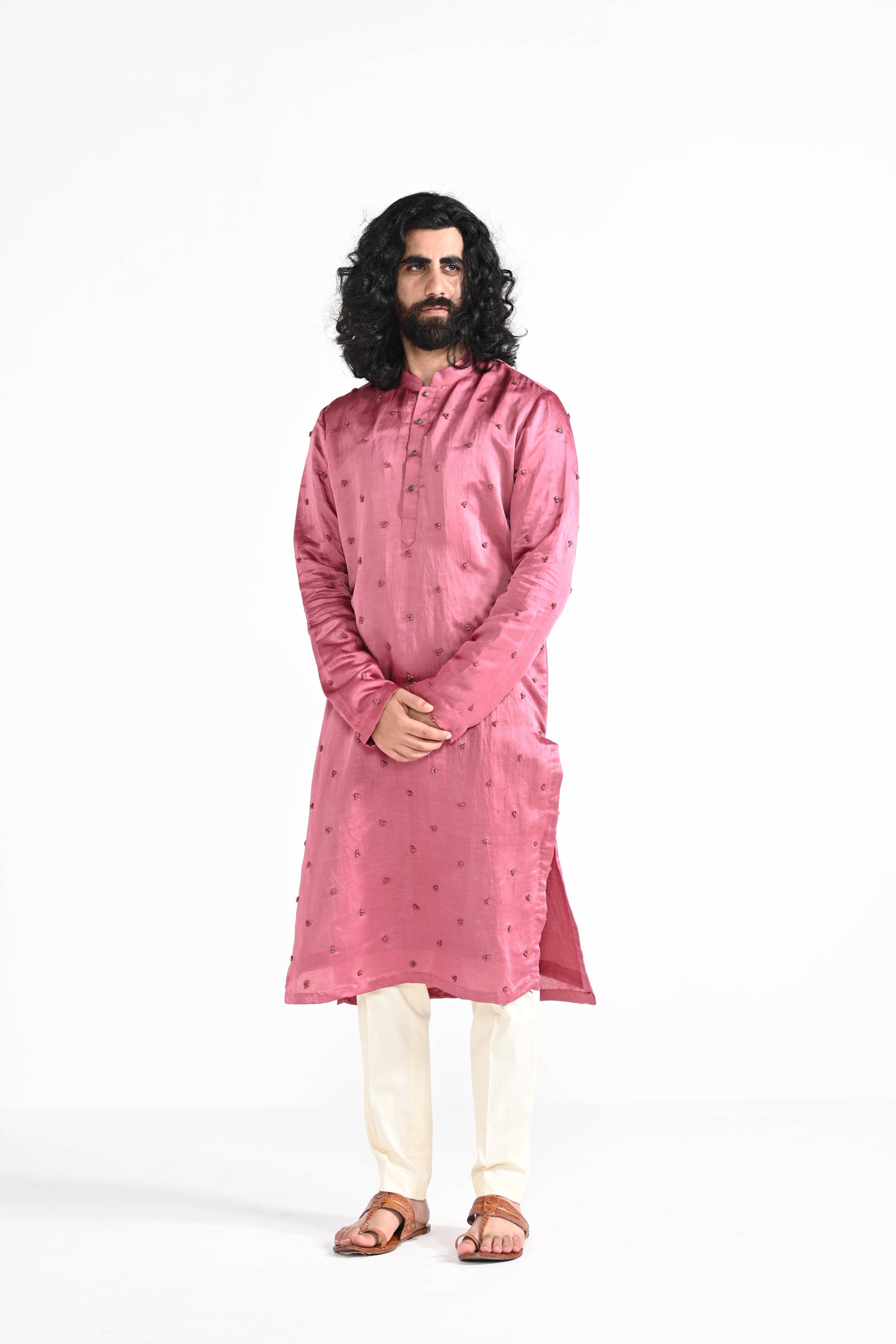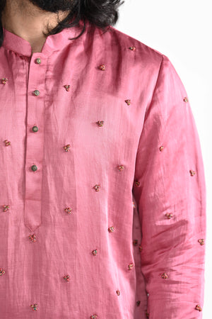 French Pink Hand emboiderded multi colour thread work on Lilen satin.Paired with Buttercream slim fit Pant Pajama. Color of the actual garment may vary due to lighting conditions during the shoot .