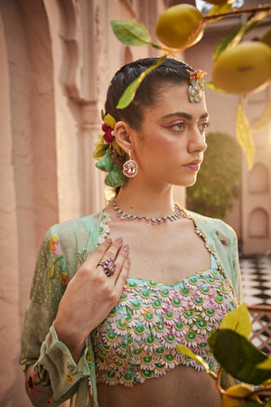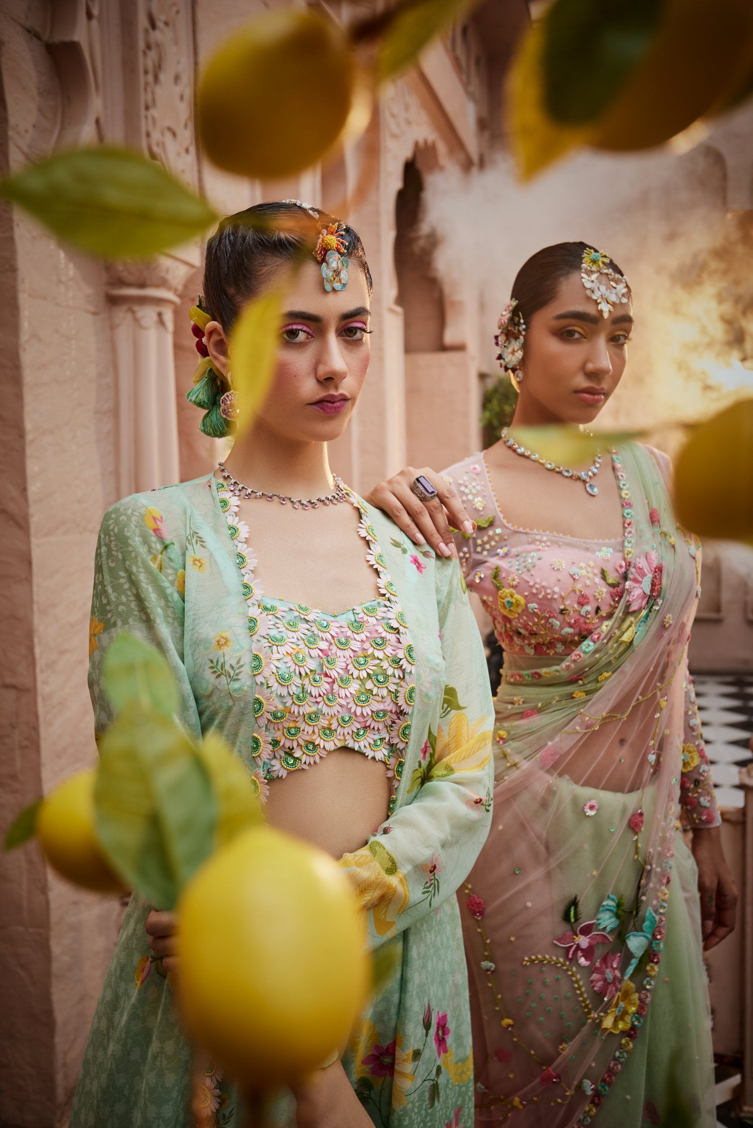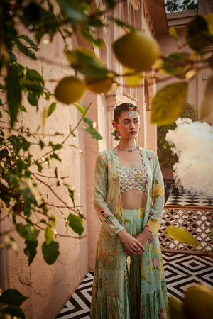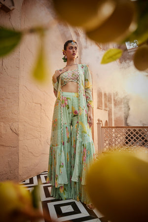 Showcasing a striking 3D-embroidered crop top paired with a beautifully printed ruched gharara, this ensemble is further enhanced by intricate embroidery on the waistband. The look is completed with a cape adorned with ruched details and 3D floral embroidery. The meticulous attention to detail in this garment truly sets it apart.