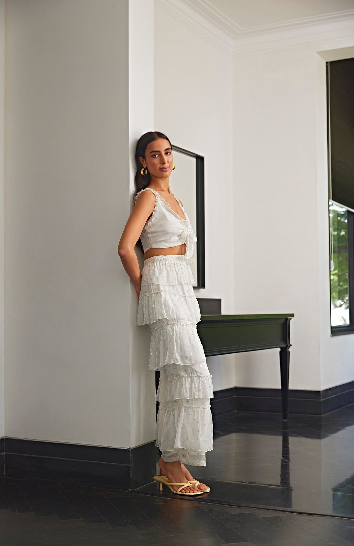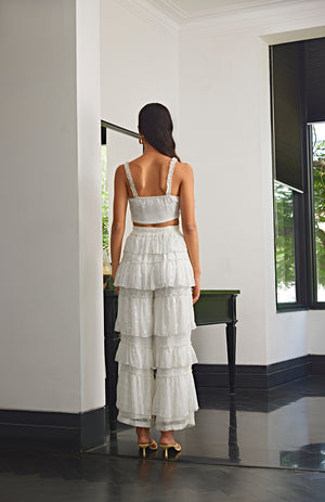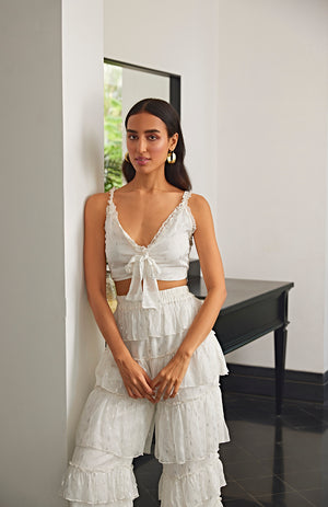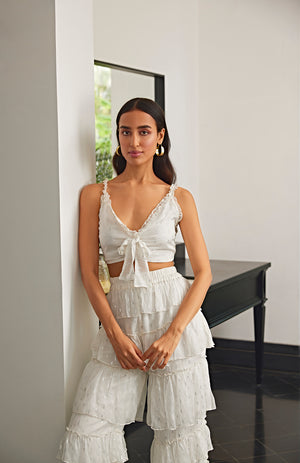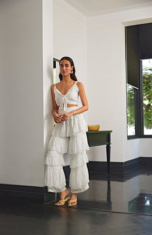 White co-ord set featuring a top with knot details and pants with frilled layers.