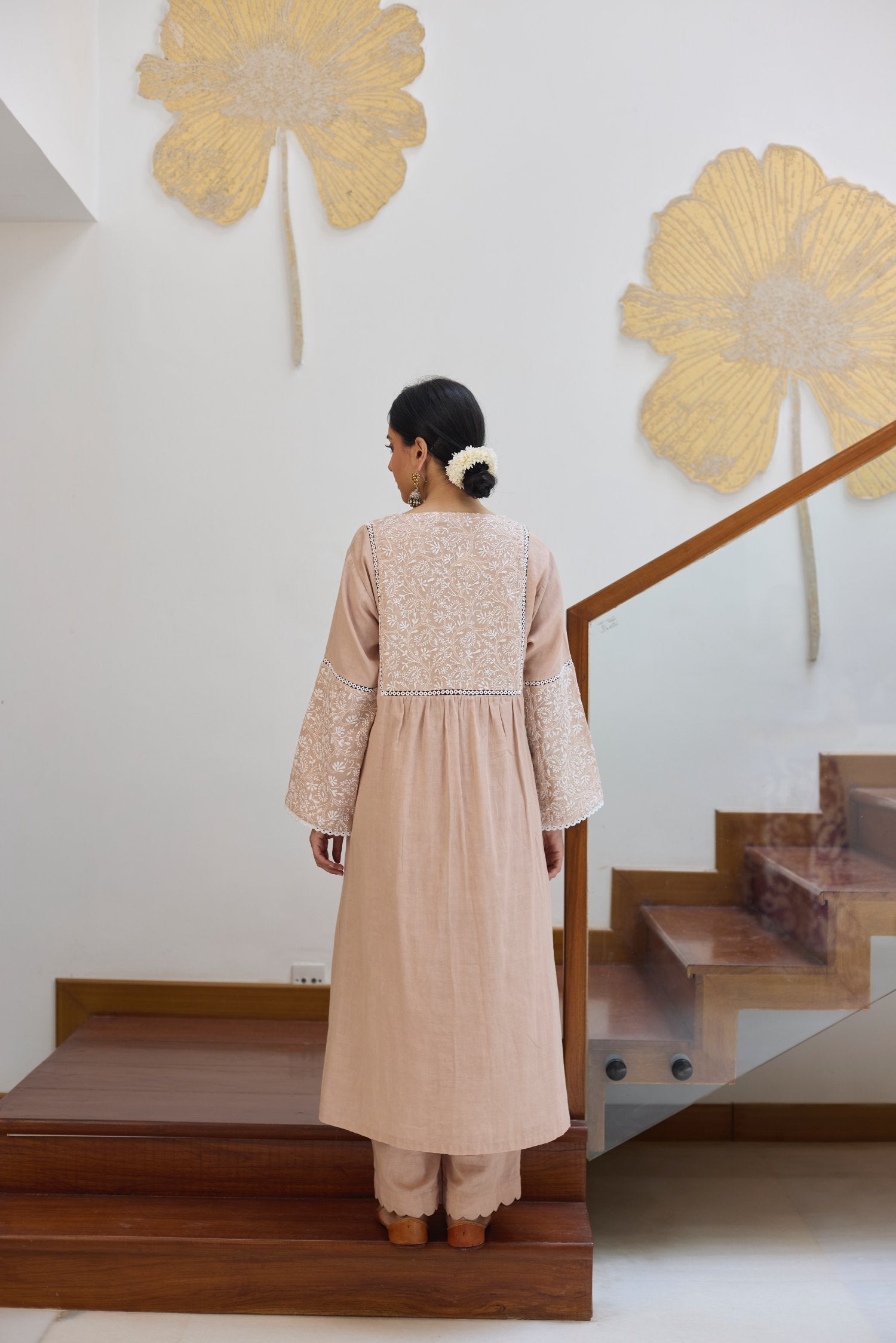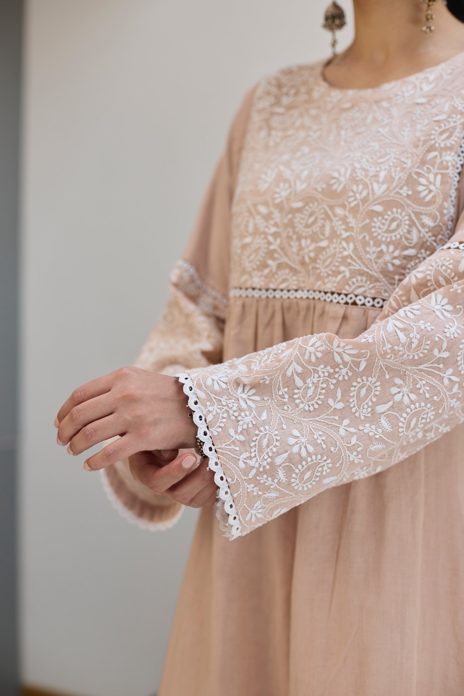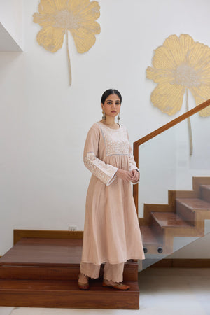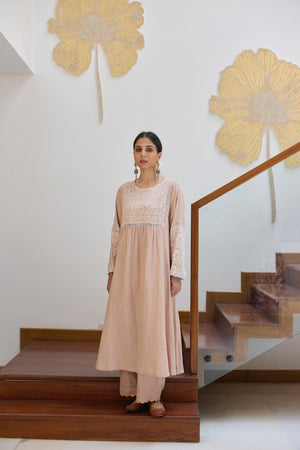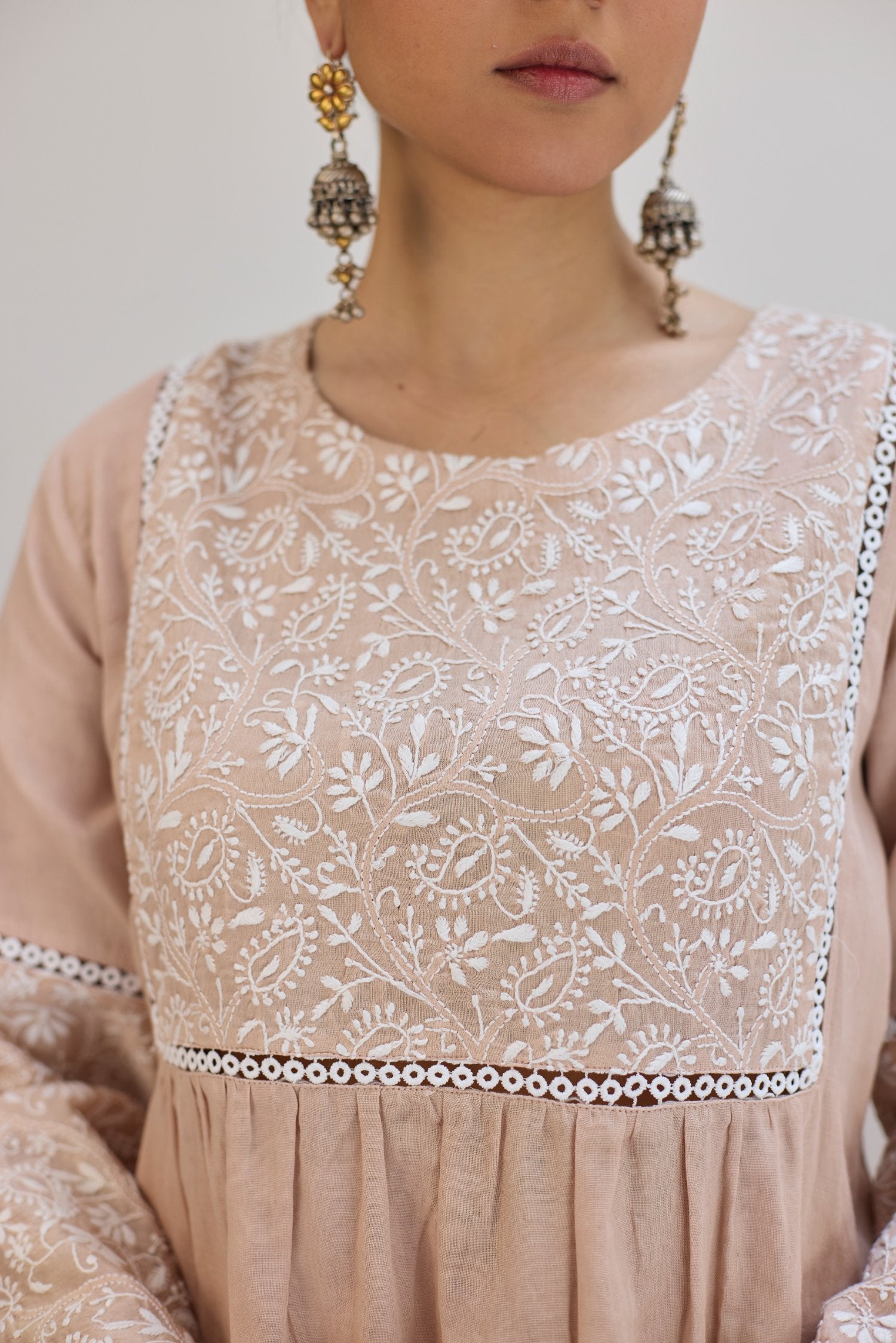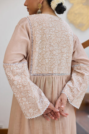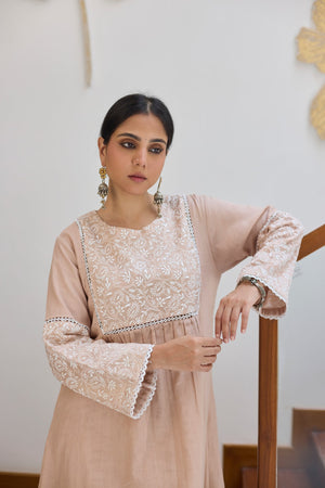This Beige kurta has a fully embroidered chikankari yoke on the front and back completed with lace. The sleeves also has same embroidered panel stiched with lace. Hemlines are finished with lace for neat look.