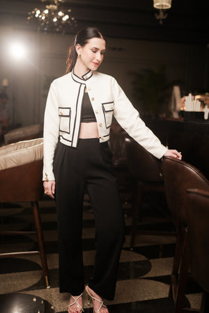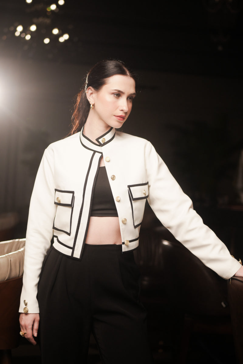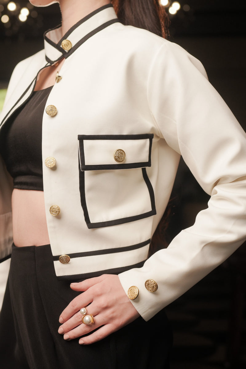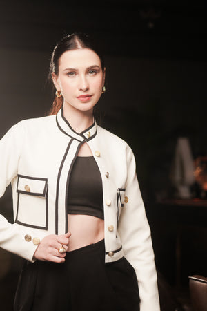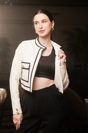a sophisticated white luxury jacket that exudes elegance and style. This jacket is a timeless piece that adds a touch of sophistication to any outfit. The pristine white color gives it a classic and chic look, perfect for both formal events and casual outings. It's a versatile wardrobe staple that radiates luxury and refinement.