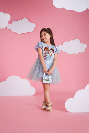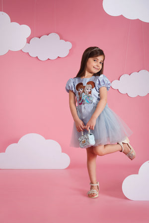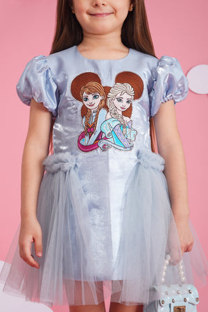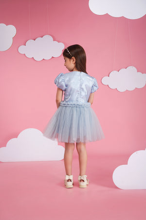 A blue lequid satin organza dress with puffed sleeves andelsa-ana embroidery in the front and tulle rufflled half skirt in the bottom
