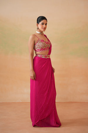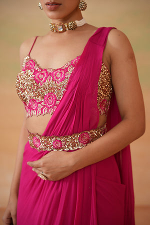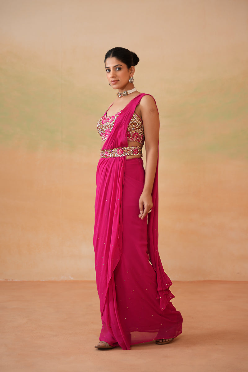 Fuchsia Embroidered Blouse, Drape Saree And Belt