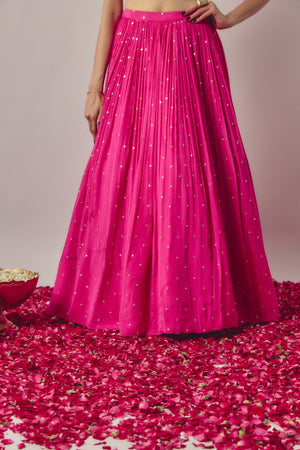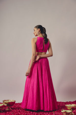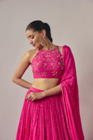 Featuring a fuchsia pink lehenga in chinon base. It is paired with a matching embroidered blouse and a dupatta.