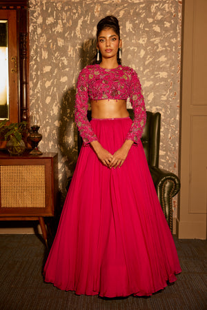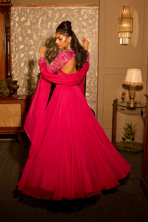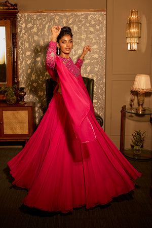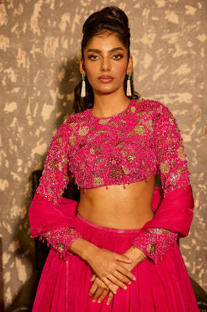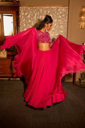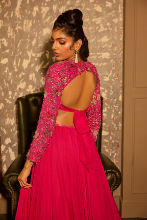 Fuchsia Lehenga Set Featuring A Flowy Organza Skirt Paired With A Embroidered Organza Dupatta. The Look Is Completed With A High-Neck, Full-Sleeve Blouse Intricately Hand-Embroidered With Sequins, Cutdana, Zari, Zardozi And Beadwork. The Bold Back Cut-Out And Tie-Up Detailing Add A Modern Twist To This Richly Crafted Silhouette ” Ideal For Sangeet Nights, Receptions, Or Festive Soirã©Es.
