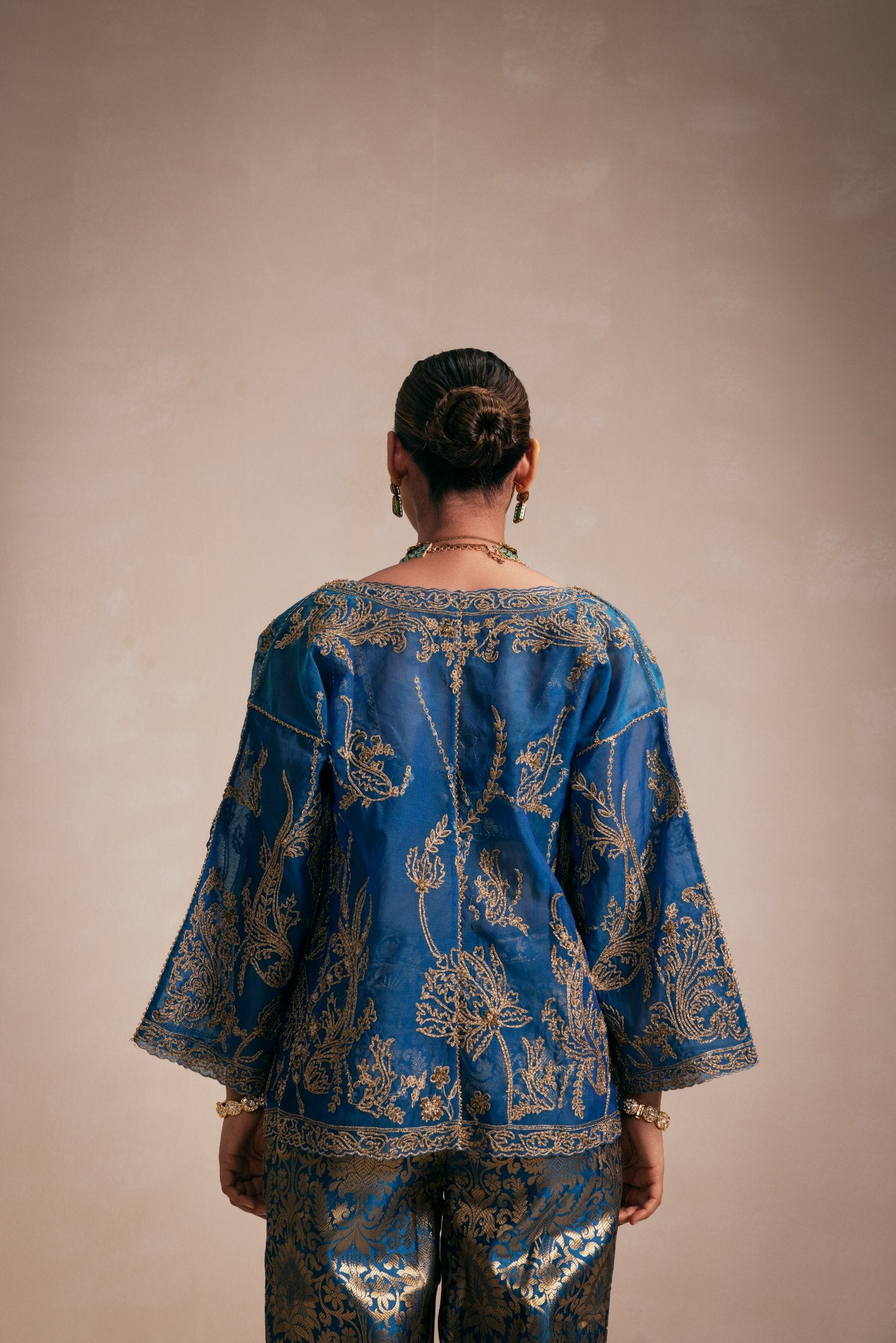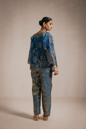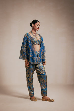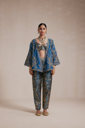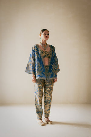 A full-embellished teal blue kimono-style jacket with intricate gold machine and hand embroidery on a Chanderi base, paired with a matching bustier and brocade pants