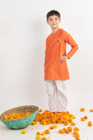 Rust Muslin Kurta With Zari Embroidered Bird Motif And Pyjama Set