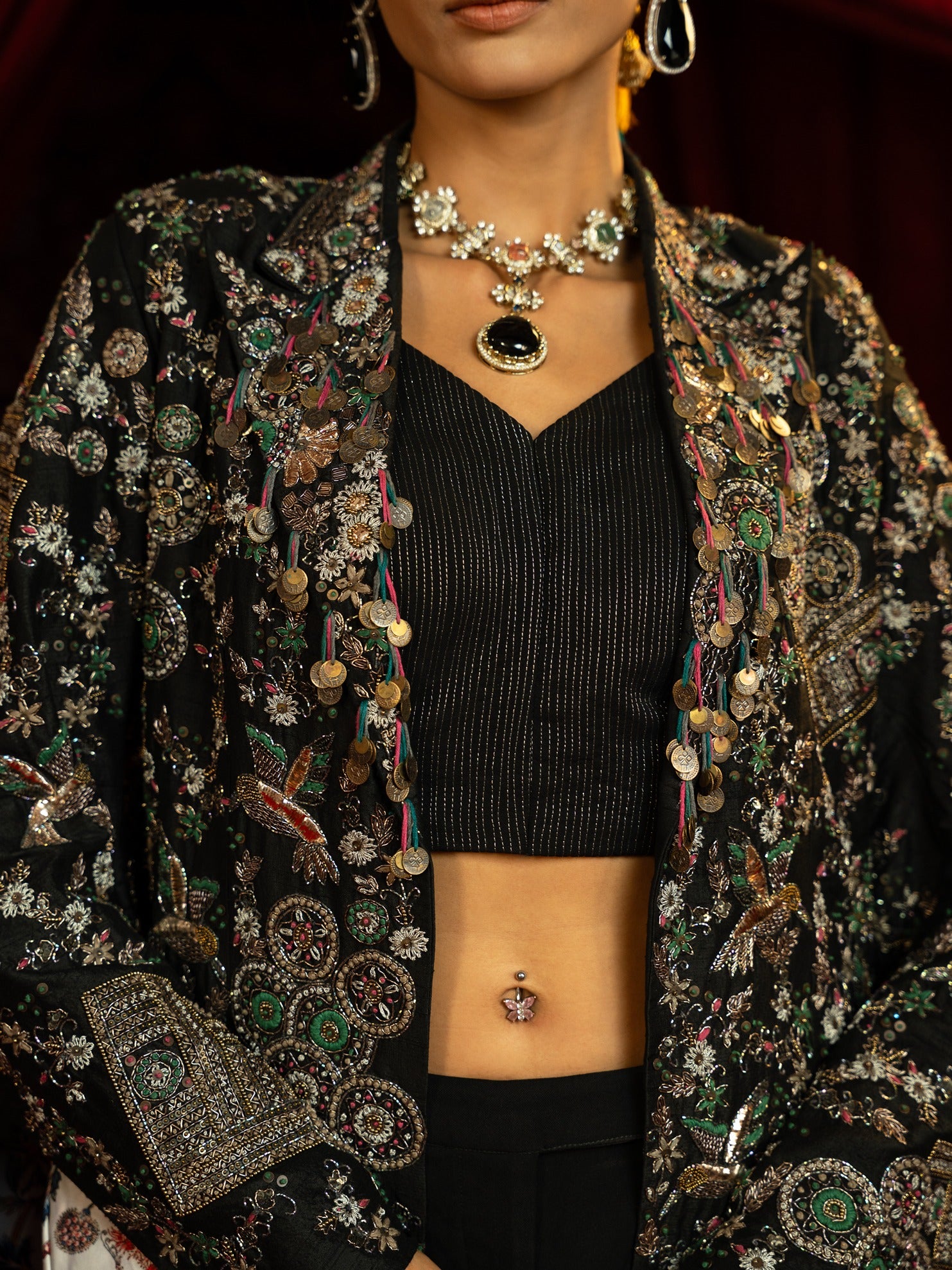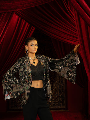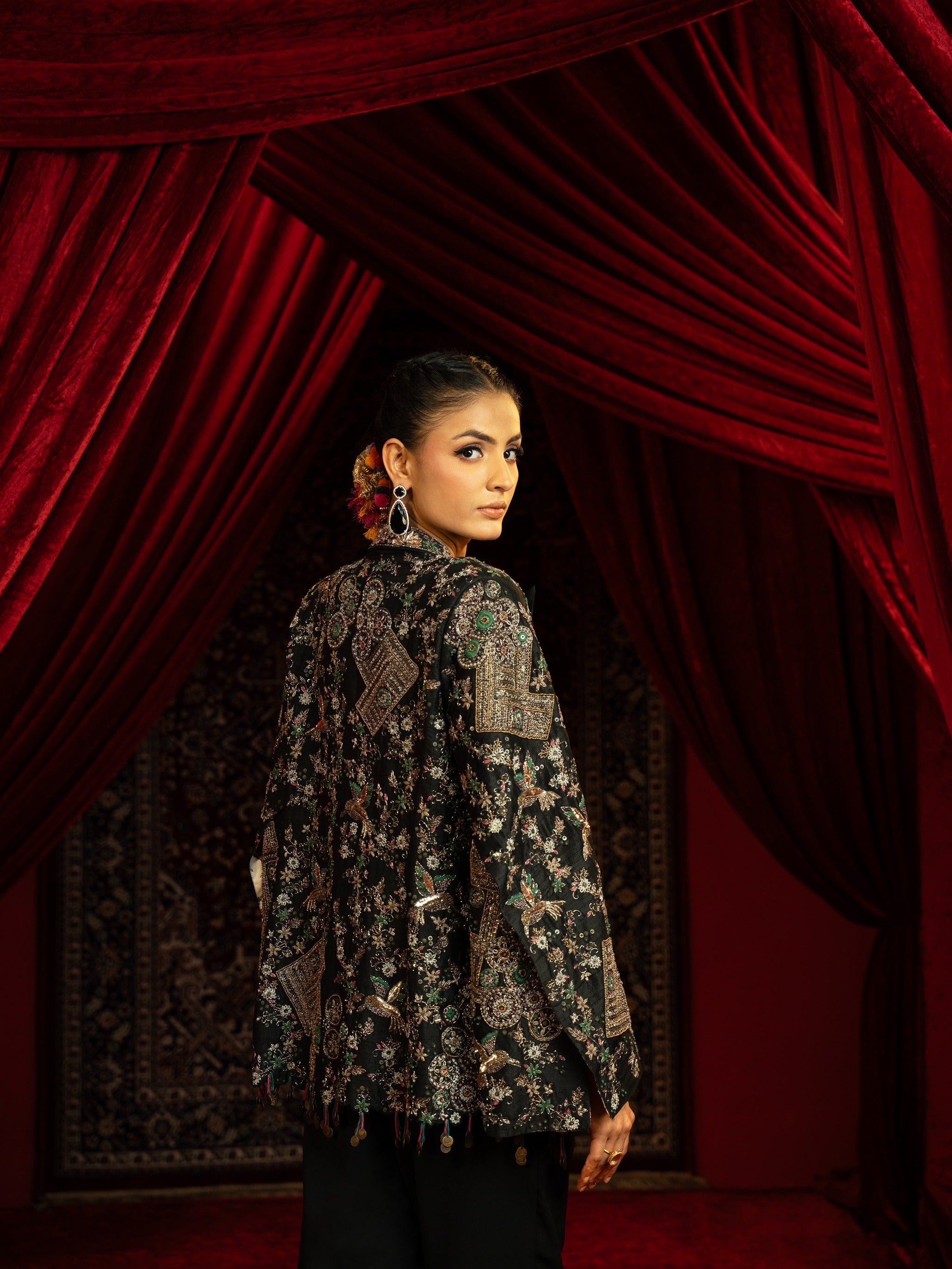 A bold and contemporary set featuring a fully vintage-embroidered stylised jacket crafted from pure raw silk (100 gms), styled with cherry crepe pant and bustier (for styling only). This ensemble merges intricate craftsmanship with modern silhouettes for a chic statement look.