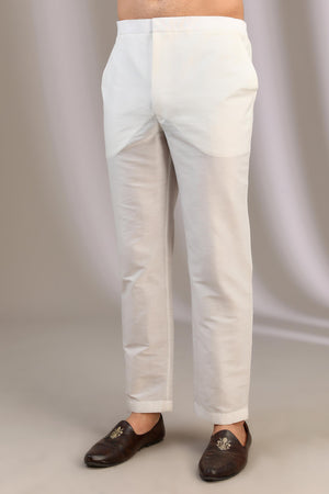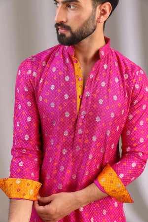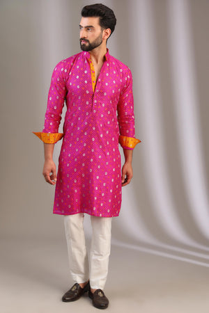FUSHIA PINK SILK UNLIED KURTA W SILVER/YELLOW BOOTI + SEQUIN W OFFWHITE COTTON SILK PANT