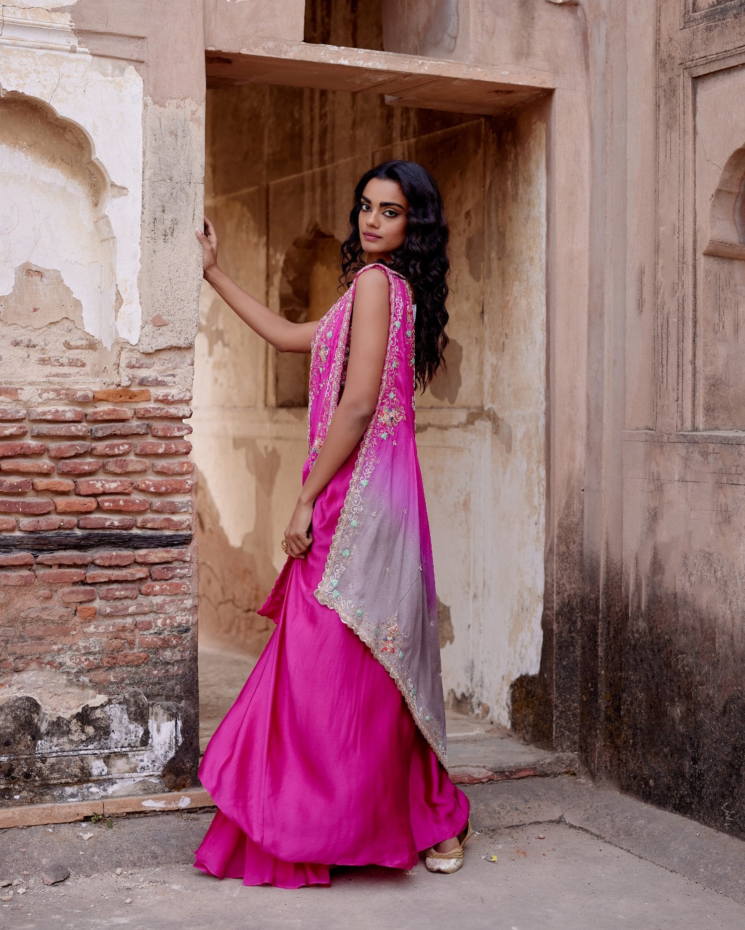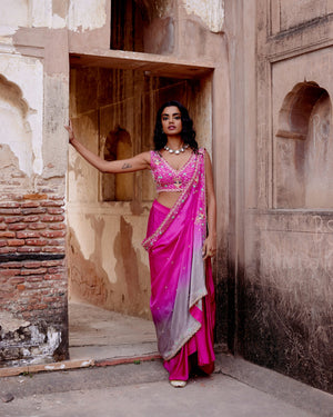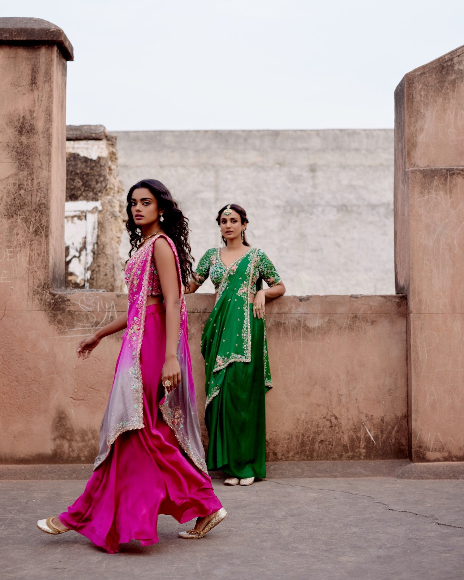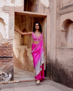 Intricate Scallop Detailed Hand Embroidered Silk Drape And Stylish Cut Blouse Styled With A Drape Skirt