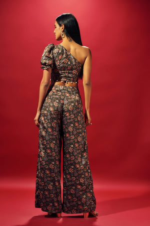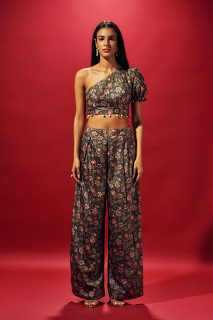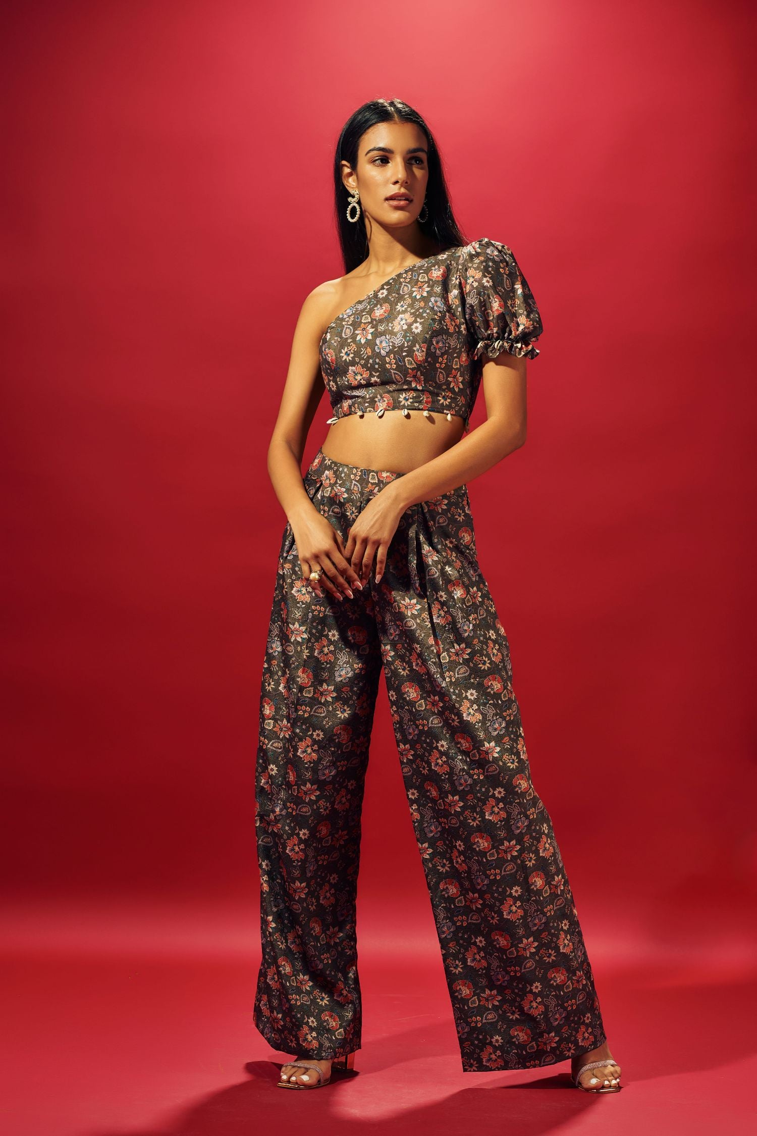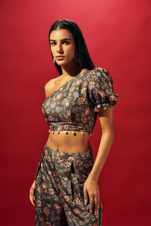 Olive green one shoulder blouse in crepe silk paired up with matching pants
