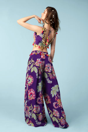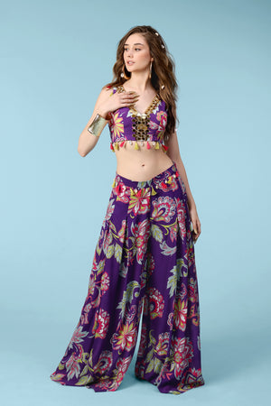 Look elegant and distinctive in this crop top and palazzo pants set. Embroidered and embellished with silk tassels and shells, this hand-crafted set is the essence of high-end fashion. Glamorous, sophisticated, and refined, this set is perfect for making a statement