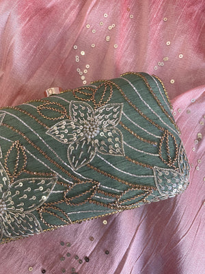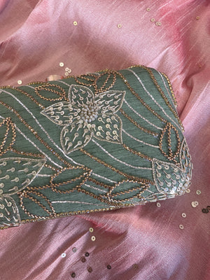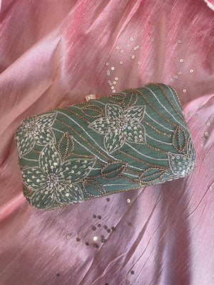 The tale of a beauty where the golden swarovski and threadwork intertwines with the shimmer of zardozi on raw silk fabric, is beautifully portrayed in this design. The olive green makes it stand out and match easily with any outfit. Hand crafted and hand embroiderd by skilled indian craftsmen, this Fusion Zardozi Floral Clutch is the new trend this season.