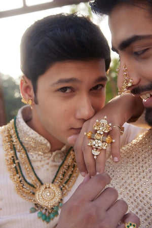 Gaj Mayura ring with elephant element on one side, peacocks on the other and emerald tube pillar in the center.