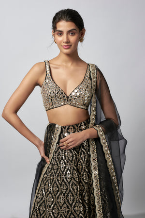 This ensemble features a blouse with a plunging neckline and is embellished with mirror and hand work.The lehenga is adorned with geometric patterns and katri mirror work. An organza dupatta with an ornate embroidered border adds a graceful touch to the outfit.
