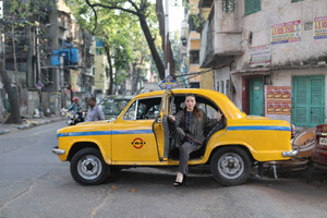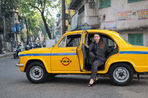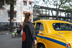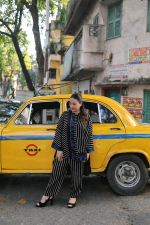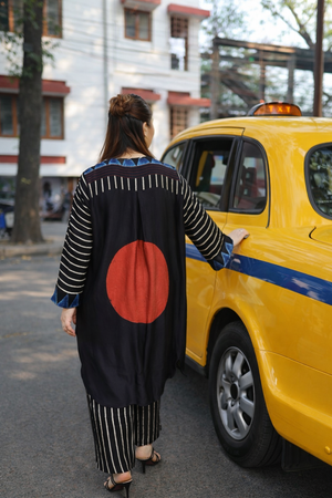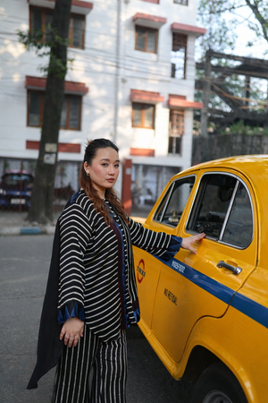 A statement co-ord set featuring bold vertical stripes and geometric patterns in black, highlighted with accents of white, and blue. The hi-low relaxed shirt is designed for everyday social and professional commitments, seamlessly transitioning from office wear to after-office style while embodying a sustainable ethos. Model height is 5'5" and is wearing a size L.